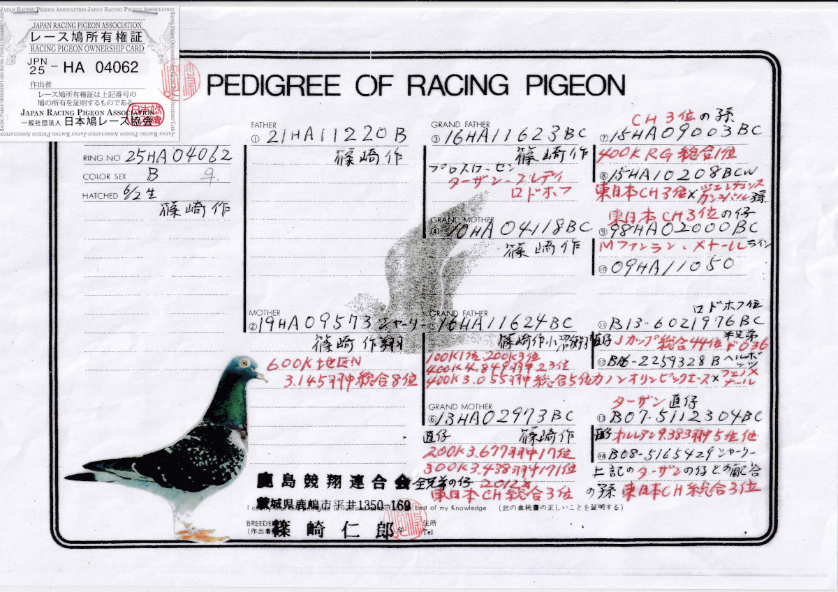 出品鳩若61番「25HA04062 B」篠崎仁郎作RG400K総合優勝の孫&12年東日本CH総合3位近親鳩×600K地区N3145羽中総合8位 ![]() |
