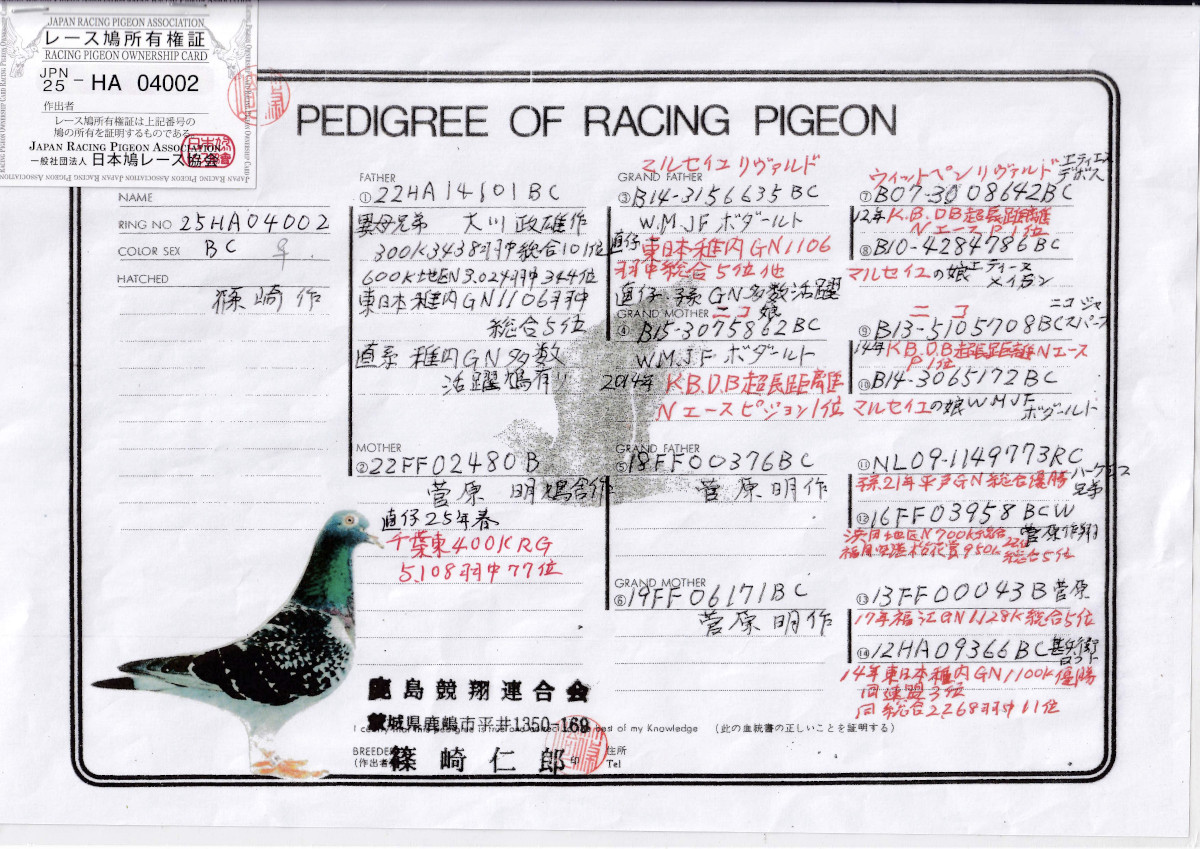出品鳩若2番「25HA04002 BC」篠崎仁郎作半兄弟)RG総合77位大川作東日本GN総合5位半兄弟×菅原作(総理大臣連盟1位直仔×東日本GN総合11位) ![]() |