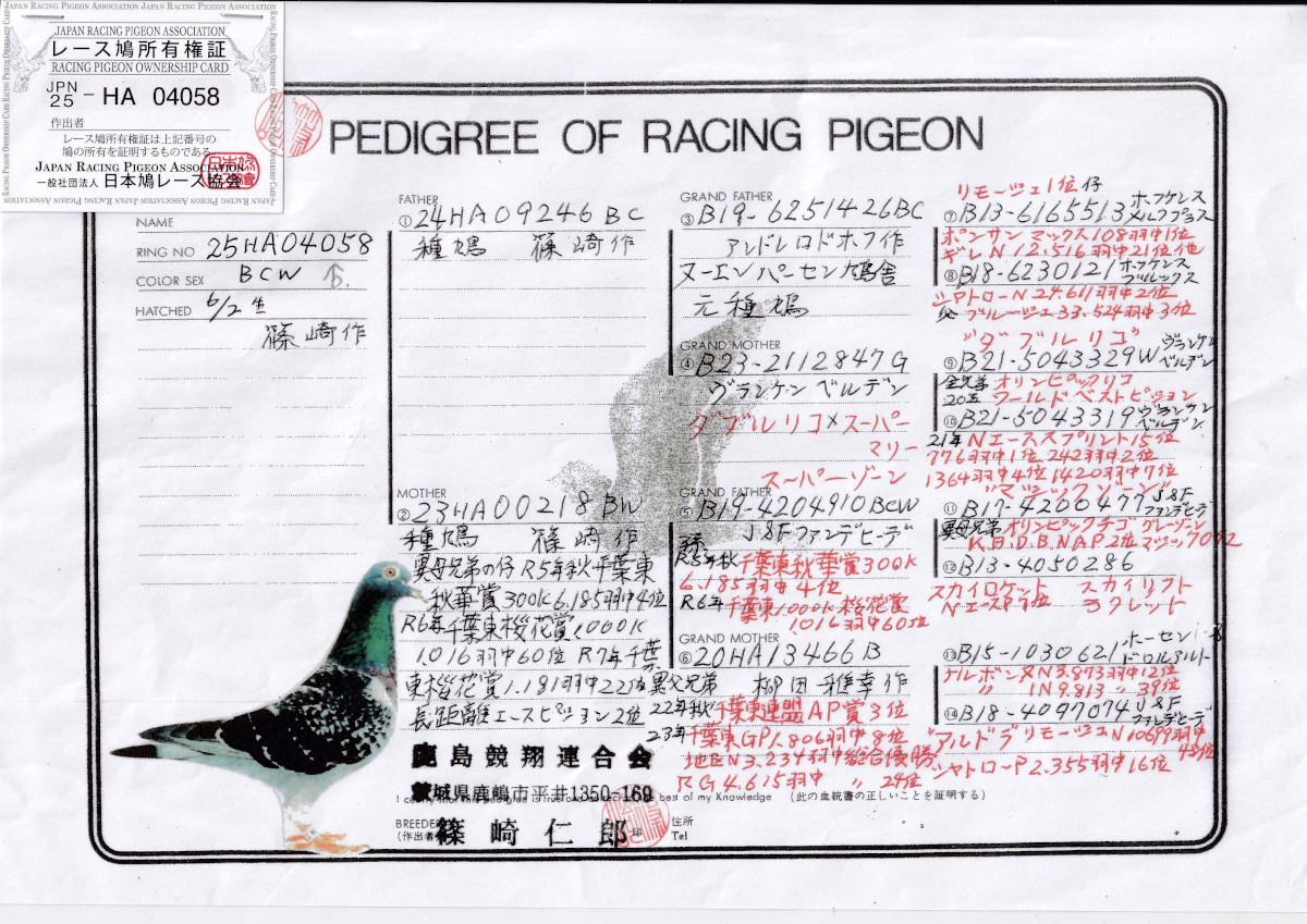 出品鳩若57番「25HA04058 BCW」篠崎仁郎作(シャトローN2位直仔×オリンピックリコ号全兄弟娘)×(KBDB-Nエース7位直仔×PN総合優勝半兄弟) ![]() |