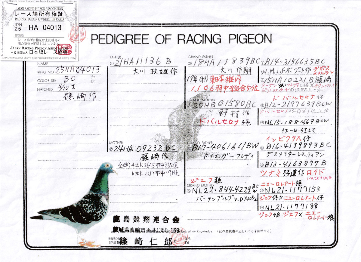 出品鳩若13番「25HA04013 BC」篠崎仁郎作大川作東日本GN1106羽総合5位直仔×(イエガーフレディ作KBDB長距離NエースP8位半兄弟×ニューロレアート近親) ![]() |