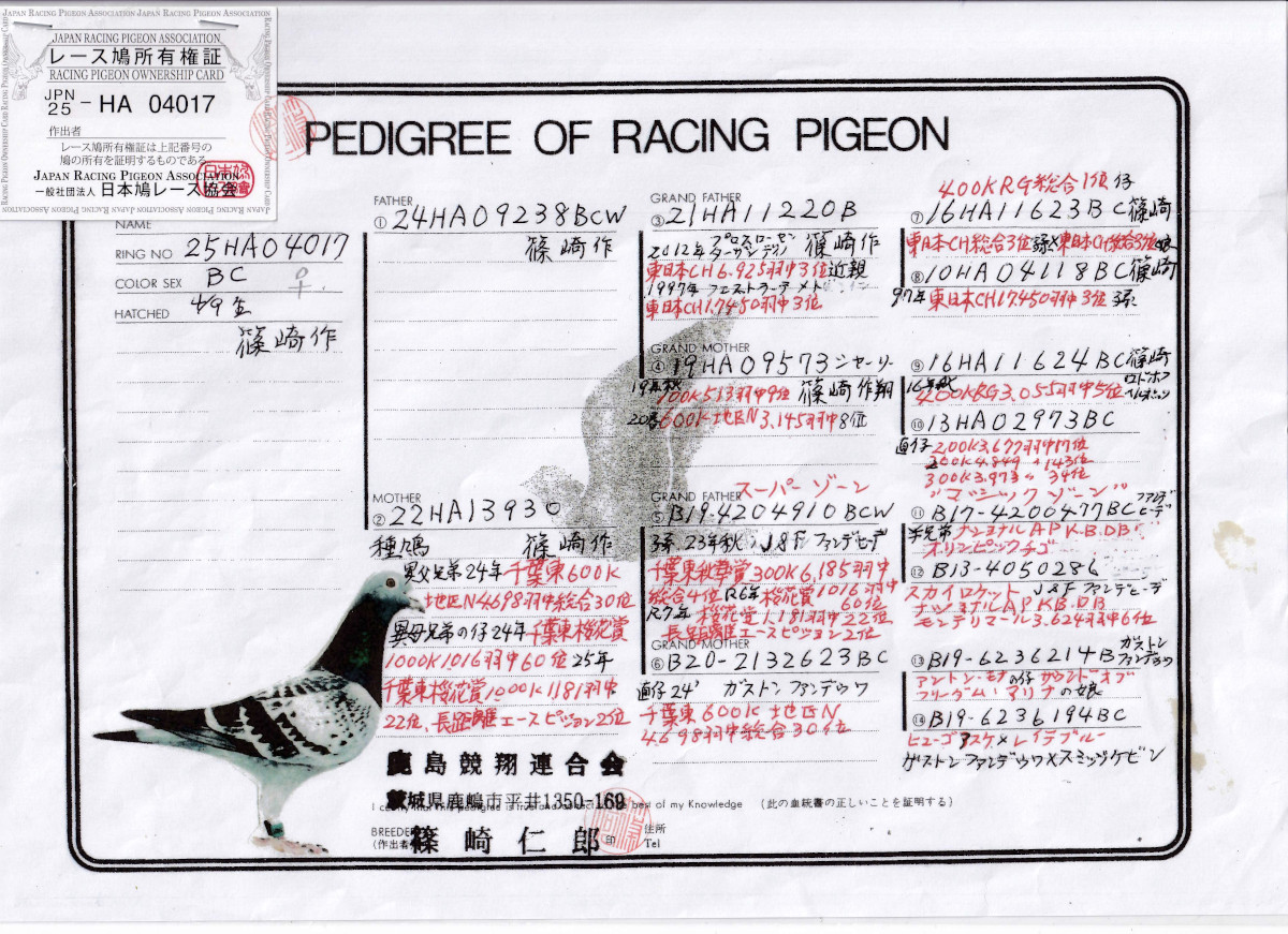 出品鳩若17番「25HA04017 BC」篠崎仁郎鳩舎作(12年CH総合3位の近親&97年CH総合3位玄孫X600K地区N3145羽中総合8位)直仔×(ファンデヒーデ作スカイロケット号KBDB-Nエース7位直仔×ガストン作カーンブール号近親鳩)娘鳩 との直仔です。 父親 ♂42番「24HA09238 BCW」篠崎仁郎鳩舎作 (12年東日本CH総合3位の近親X97年東日本CH総合3位の孫)直仔X600K地区N3145羽中総合8位鳩 との直仔です。 母親 「21HA13930 BCW」篠崎仁郎鳩舎作 異父兄弟に千葉東地区N600K4698羽中総合30位鳩がいる Fファンデヒーデ作スカイロケット号KBDB-Nエース7位直仔×ガストン作カーンブール号近親鳩 との直仔です。 詳しくは、添付の血統書の参照をお願いいたします。 <備考> 現在管理人の鳩舎で元気に過ごしています。写真は12/3日に撮影しました。 菅原明鳩舎の概要はこちらをご覧ください |