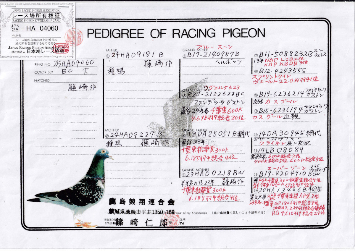 出品鳩若59「25HA04060 BC」篠崎作PN総合30位全兄弟(KBDBNatAP3位優勝10回直仔×カースブール近親)×(アジロヤンセン系×スーパーゾーン号娘) ![]() |
