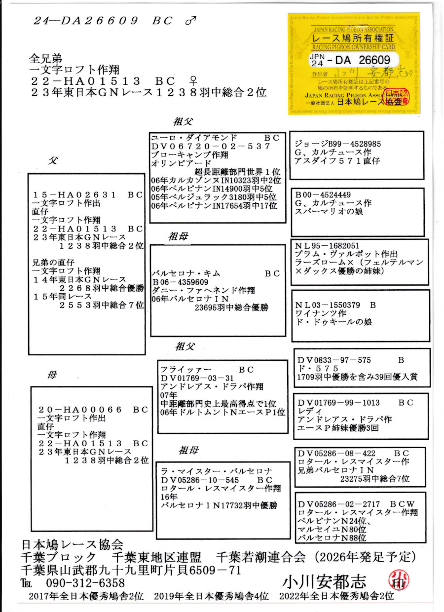 出品鳩成18番「24DA26609 BC♂」小川安都志作 全兄弟)一文字作翔23年東日本GN1238羽総合2位 ユーロダイヤモンド直仔×フライツァー娘 ![]() |