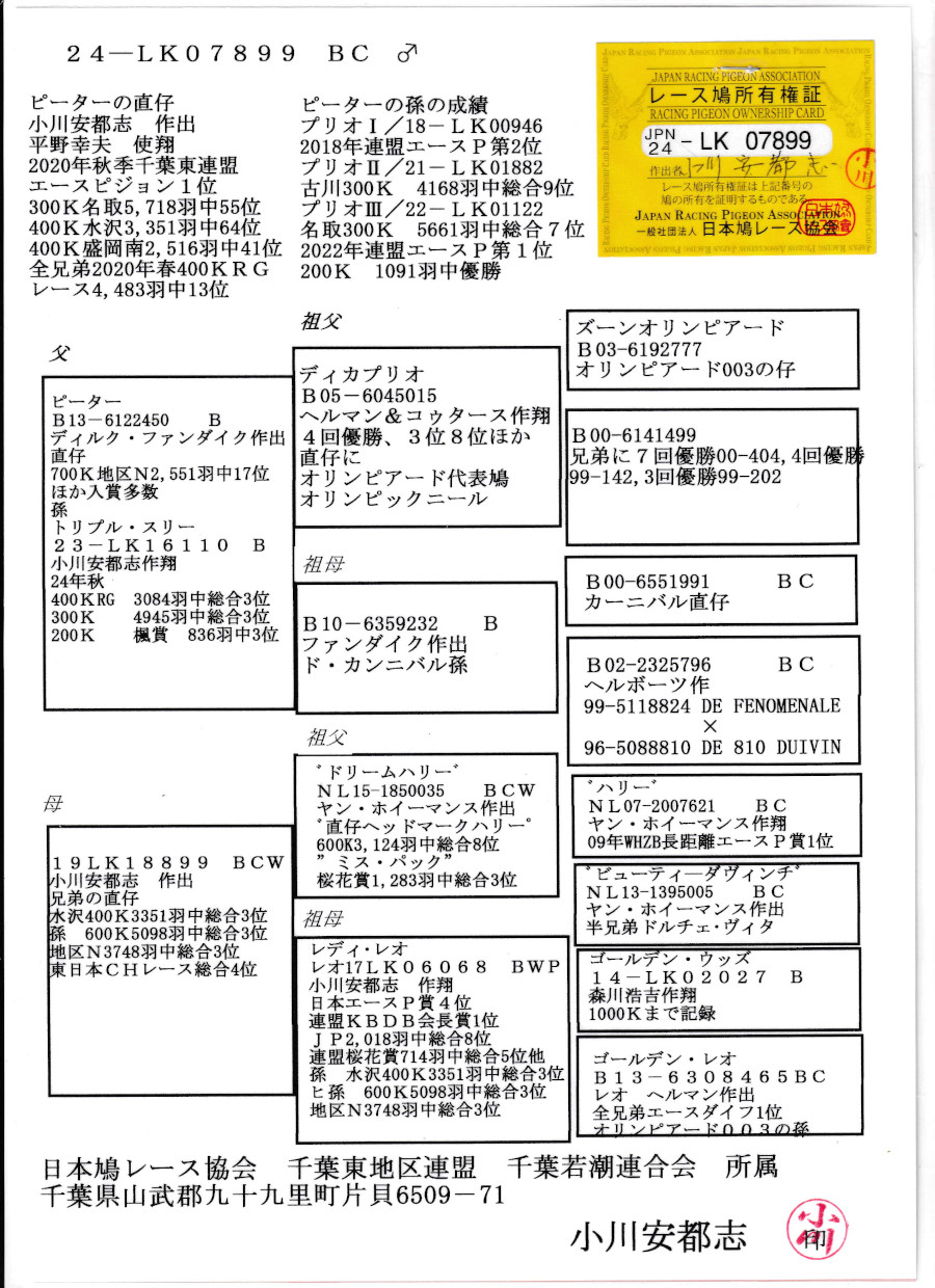 出品鳩成5番「24LK07899 BC♂」小川安都志作半兄弟)地区N2551羽中総合17位秋連盟AP位 ファンダイク作超銘鳩デカプリオ号直仔×(ドリームハリー号×JC総合8位) ![]() |