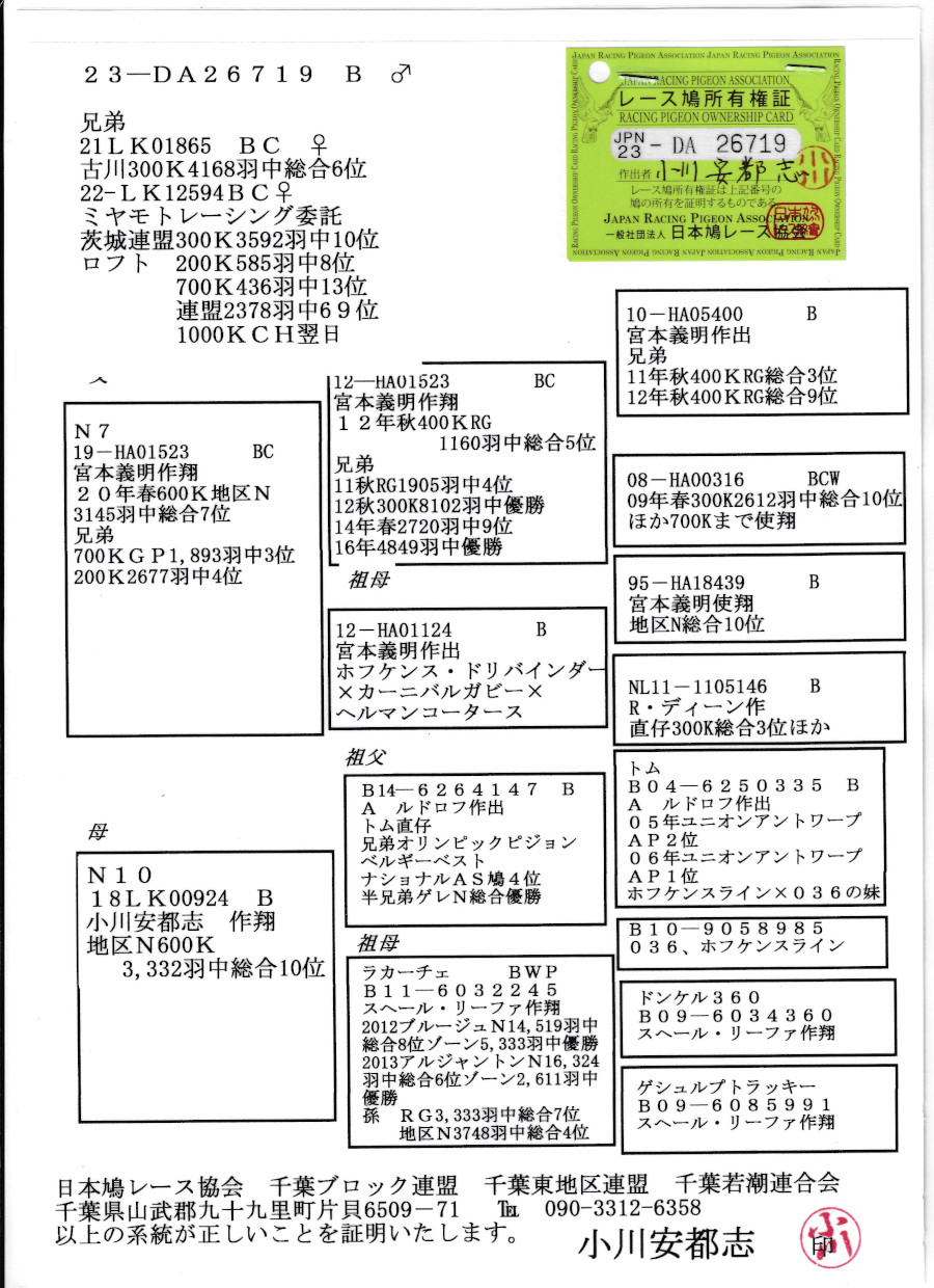 出品鳩成2番「23DA26719 B♂」小川安都志作全兄弟)300K総合6位 300K総合10位GP総合69位 N7号PN総合7位×N10号PN総合10位 ![]() |