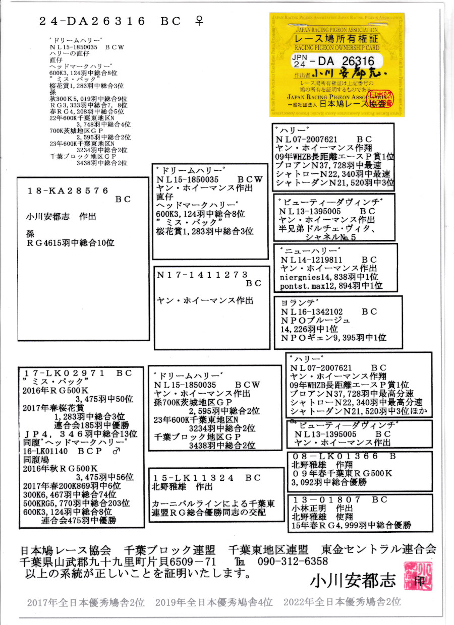 出品鳩成6番「24DA26316 BC♀」小川安都志作ドリームハリー号直仔×直娘 ヘッドマークハリー600K総合8位&ミスパック半兄弟×ミスパック桜花賞総合3位 ![]() |