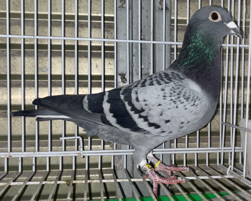 出品鳩若5番「25LK09964 BC」小川安都志鳩舎作 ヘンドリクス父子作 (ランボーハリー号&ハリー号の直仔×シスターナショナル号長距離NatAP1位シャトローN1位の全兄弟)直仔×(ドリームハリー号&ハリー号直仔×ドリームハリー号孫鳩&秋RG3333羽総合7位)娘鳩 との直仔です。 父親 「NL21−1423401 BC」ジョー・ヘンドリクス父子鳩舎作 ランボーハリー号(アッセ・ゼリックPv4544羽優勝の同腹&ハリー号の直仔)×シスターナショナル号(ナショナルハリー号長距離NatAP1位シャトローN1位の全兄弟) との直仔です。 母親 「20DA02263 BCW」小川安都志鳩舎作 ドリームハリー号(ハリー号×ビューティダヴィンチ号)×ドリームハリー号孫鳩(秋RG3333羽総合7位)との直仔です 詳しくは、血統書を参照してください。 <備考> 現在管理人の鳩舎で元気に暮らしています。写真12/6日に撮影しました。 菅原明鳩舎の概要はこちらをご覧ください |