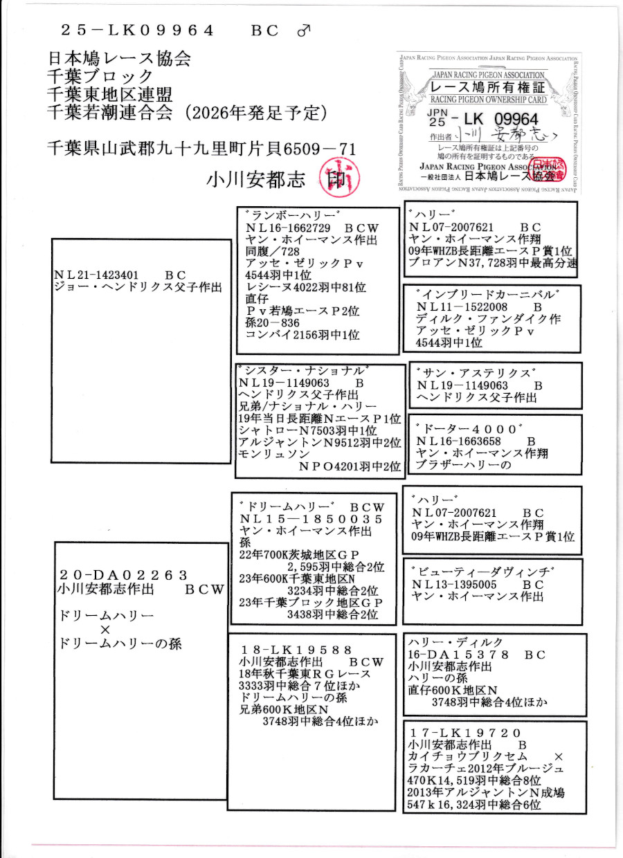 出品鳩若5番「25LK09964 BC」小川作ヘンドリックス作(ランボーハリー号×ナショナルハリー号実妹)×(ドリームハリー号×左記同孫鳩&秋RG総合7位) ![]() |