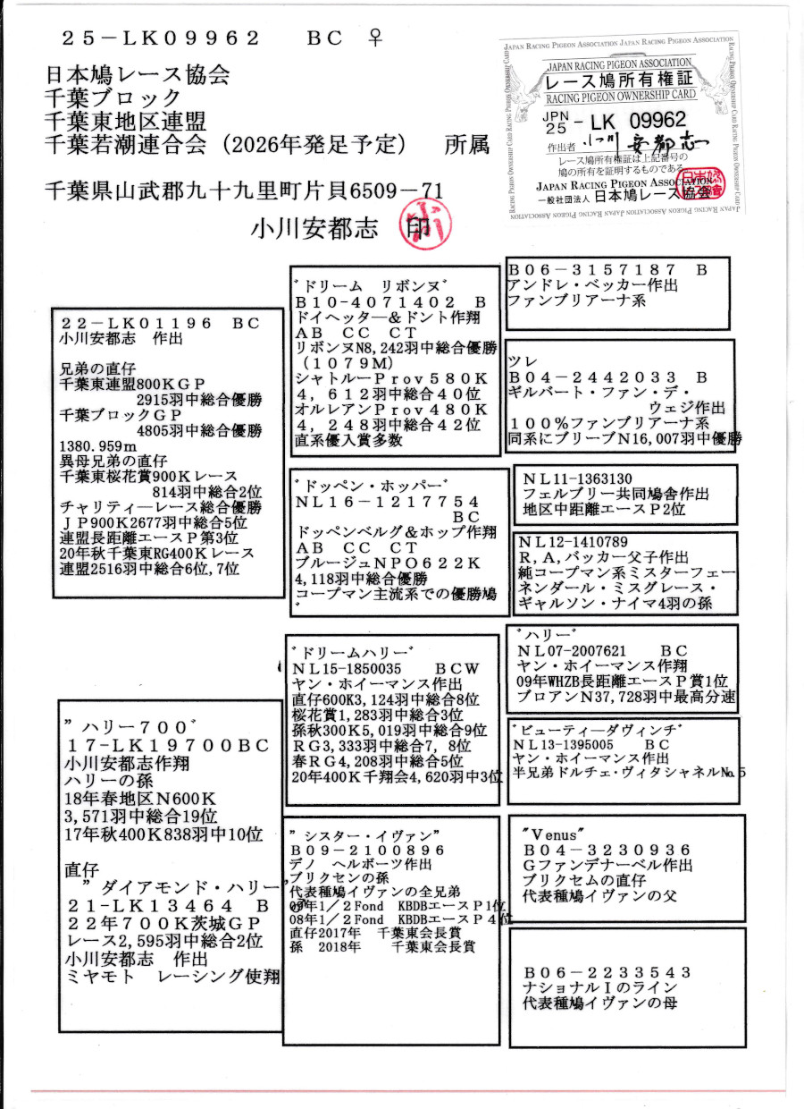 出品鳩若3番「25LK09962 BC」小川安都志作(ドリームリボンヌ号リボンヌN総合優勝×ドッペンホッパー号ブルージNPO優勝)×ハリー700号PN3571羽総合19位 ![]() |