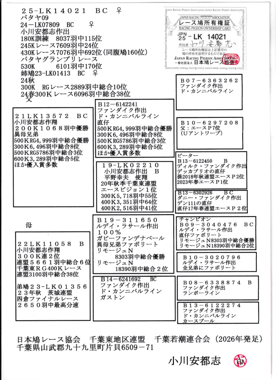出品鳩若21番「25LK14021 BC」小川安都志鳩舎作 全兄弟にパタヤ委託レース430K7076羽160位692位パタヤGP530K6101羽170位鳩 RG300K2889羽総合10位鳩がいる 純ファンダイク系200k1068羽優勝 ×カビー・ファンダイク系300k2位5661羽総合6位 RG400K3100羽総合38位入賞鳩 との直仔です。 父親 「21LK13572 BC」小川安都志鳩舎作 200K1068羽優勝 異母兄弟に RG500K4999羽総合優勝同5786羽総合3位600k3289羽総合5位入賞鳩がいる ファンダイク作カンニバルライン鳩 ×両親ファンダイク作デカプリオ号孫鳩&連盟エースP賞1位鳩 との直仔です。 母親 「22LK11058 B」小川安都志鳩舎作翔 300k2位5661羽総合6位 RG400K3100羽総合38位 弟鳩も 四倉ファイナル2650羽最高分速鳩がいる 純カビー系ファフセリート号リモージュn8303羽優勝18390羽総合2位の異母兄弟鳩 ×ファンダイク作カンニバルライン鳩 との直仔です。 詳しくは、血統書を参照してください。 <備考> 現在管理人の鳩舎で元気に過ごしています。写真は12/6日に撮影しました。 菅原明鳩舎の概要はこちらをご覧ください |