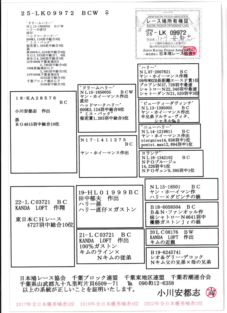 出品鳩若7番「25LK09972 BCW」小川安都志鳩舎作 ドリームハリー号直仔×直娘交配 ヘッドマークハリー号600K3124羽総合8位鳩&ミス・パック号の異母兄弟×神田L作翔23年東日本CH1000K4727羽総合10位入賞鳩 との直仔です。 父親 「18KA28576 BC」小川安都志鳩舎作 異母兄弟に ヘッドマークハリー号600K3124羽総合8位鳩 ミス・パック号桜花賞1283羽総合3位 孫鳩に RG4615羽総合10位鳩がいる 両親ヤン・ホーイマン作 ドリーム・ハリー号(ハリー×ビュティーダビンチ) × (ニューハリー×ヨランデ)娘鳩 との直仔です。 母親 「22LC03721 BC」神田ロフト作翔 23年東日本CH1000K4727羽総合10位入賞鳩で ハリー号孫鳩×純ガストン系キム号ライン鳩 との直仔です。 詳しくは、添付の血統書を参照して下さい。 <備考> 現在管理人の鳩舎で元気に暮らしています。写真12/6日に撮影しました。 菅原明鳩舎の概要はこちらをご覧ください |