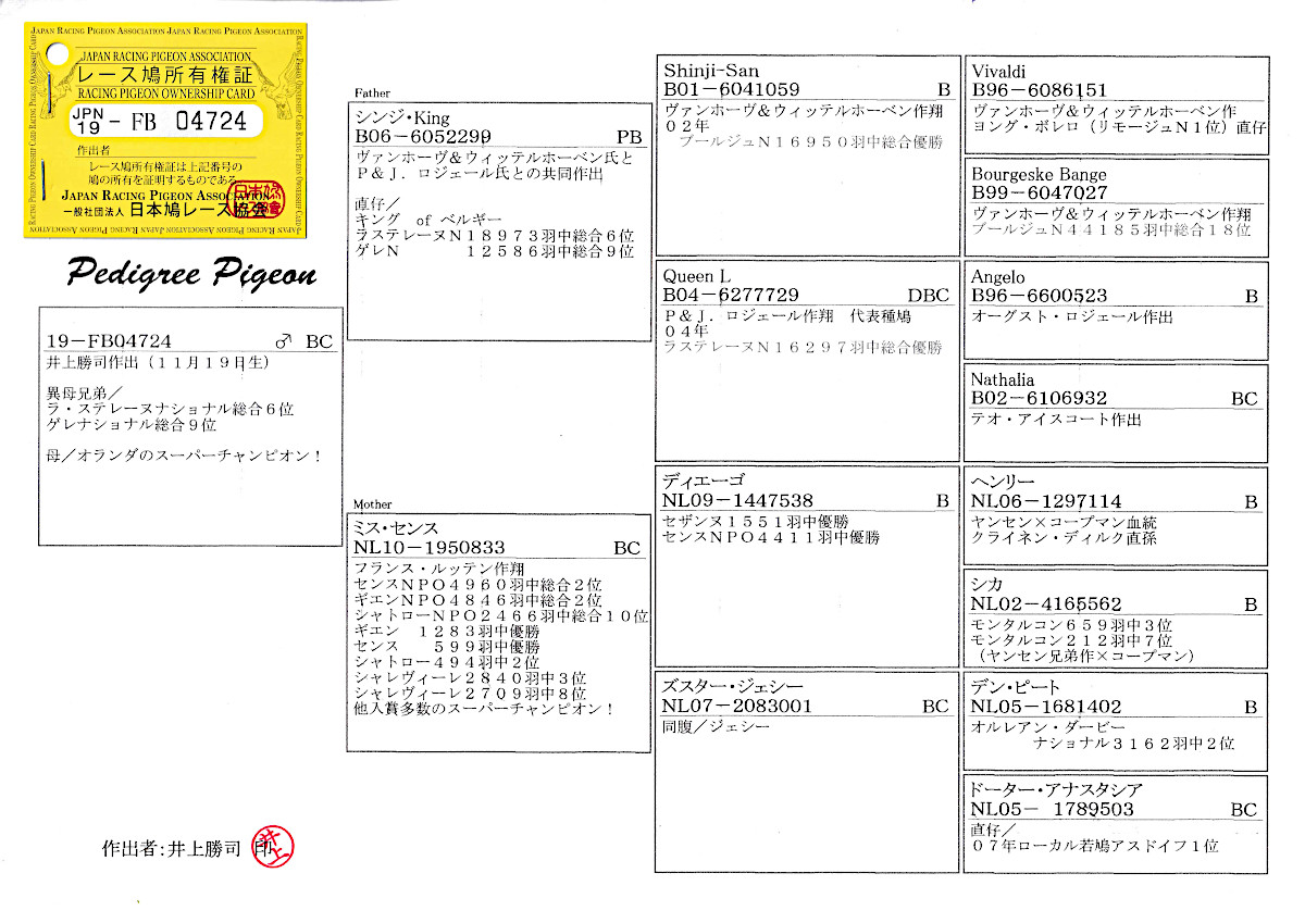 出品鳩「19FB04724 BC♂」井上勝司作半兄弟ラステレーヌN6位ゲレN9位 (ブールジュN総合優勝×ラステレーヌN総合優勝)×センス&ギエンNPO総合2位 ![]() |