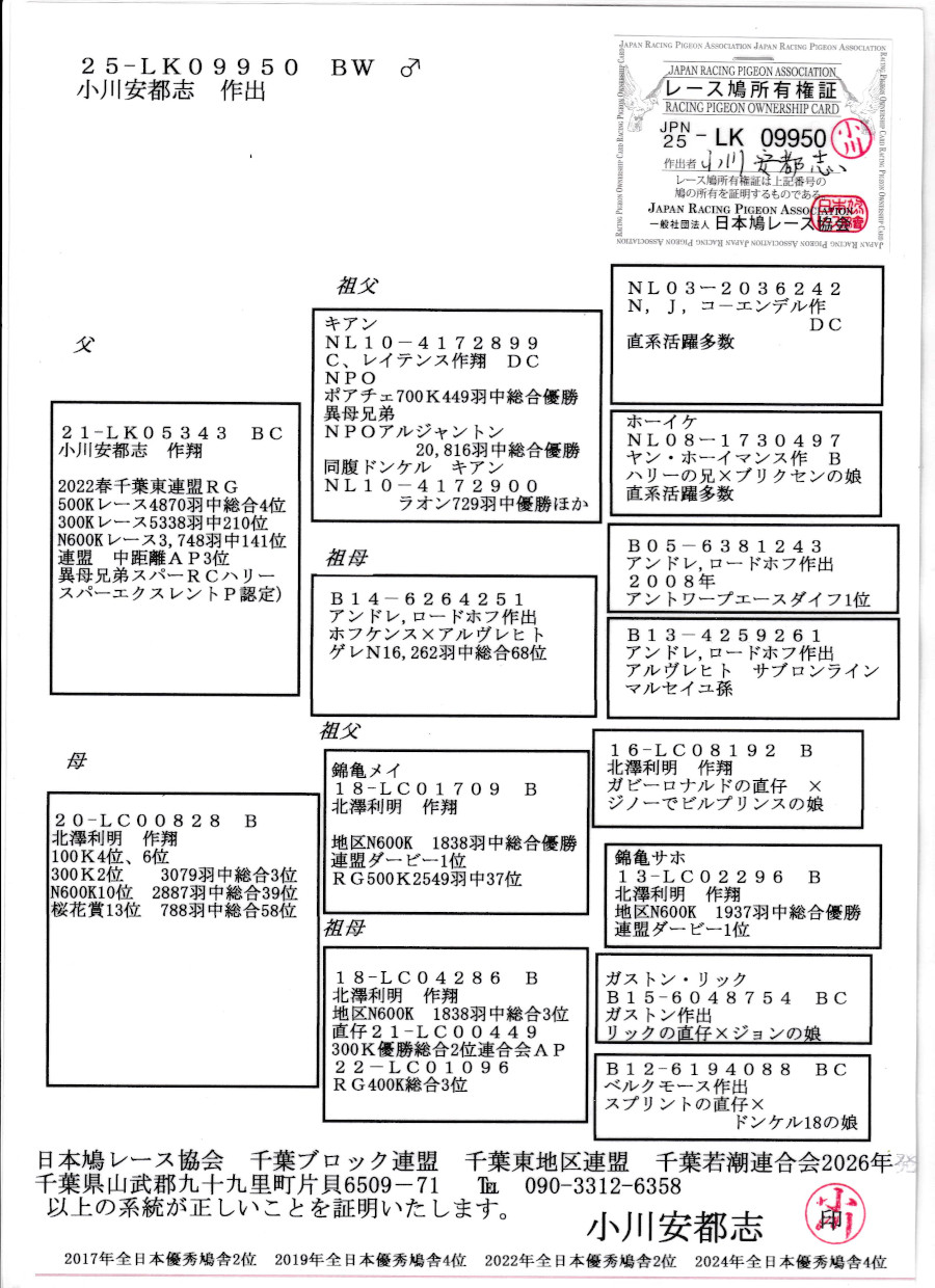 出品鳩若6番「25LK09950 BW」小川安都志鳩舎作RG500K4870羽総合4位地区N3748羽総合141位中距離AP3位(レイテンス作翔キアン号ポアチェNPO総合優勝×ロードホフ作翔ゲレN16262羽総合68位)×北澤作翔 300K3079羽総合3位地区N2887羽総合39位桜花賞788羽総合58位鳩 との直仔です。 父親 「21LK05343 BC」小川安都志鳩舎作翔 RG500K4870羽総合4位地区N3748羽総合141位中距離AP3位 異母兄弟にスーパーRCハリー号がいる レイテンス作翔キアン号ポアチェNPO総合優勝×ロードホフ作翔ゲレN16262羽総合68位鳩 との直仔です。 母親 「20LC00828 B」北澤利明鳩舎作翔 300K3079羽総合3位地区N2887羽総合39位桜花賞788羽総合58位鳩で 錦亀メイ号地区N1838羽総合優勝×ガストン系地区N1838羽総合3位鳩 との直仔です。 詳しくは、血統書を参照してください。 <備考> 現在管理人の鳩舎で元気に暮らしています。写真12/6日に撮影しました。 菅原明鳩舎の概要はこちらをご覧ください |