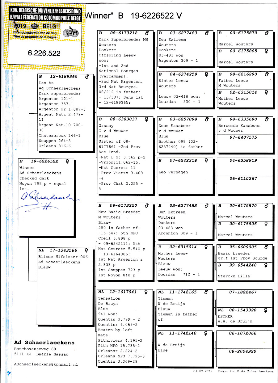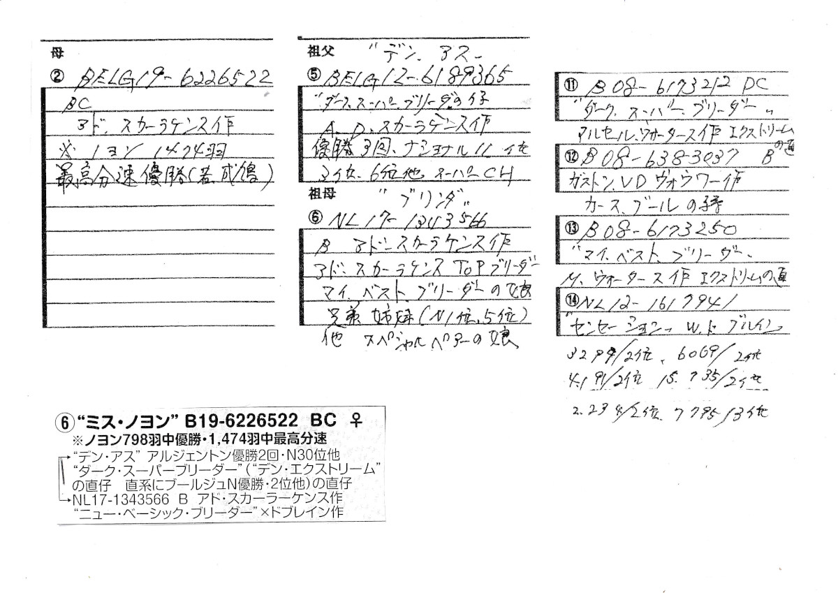 出品鳩「B19−6226522 BC ♀」アド・スカーラケンス鳩舎作翔ノヨン798羽優勝1474羽最高分速鳩で デン・アス号優勝3回ナショナル11位3位6位鳩 ×(エムストリーム号直仔×ドブレイン作センセーション号3299羽2位6069羽2位4191羽2位15735羽2位2334羽2位)娘鳩 との直仔です。 父親 "デン・アス号"「B12−6189365」アド・スカーラケンス鳩舎作翔 優勝3回ナショナル11位3位6位鳩で マルセル・ウォータース作ダ−クスーハーブリダー号(エムストリーム号直仔)×ガストン作カースブール号孫鳩 との直仔です。 母親 "ブリンダ号"「NL17−1343566 B」アド・スカーラケンス鳩舎作 マルセル・ウォータース作マイスーハーブリダー号(エムストリーム号直仔)×ドブレイン作センセーション号3299羽2位6069羽2位4191羽2位15735羽2位2334羽2位鳩 との直仔です。 詳しくは、血統書を参照してください。 <備考> 振込または、現金書留でお願いします。 菅原明鳩舎の概要はこちらをご覧ください |