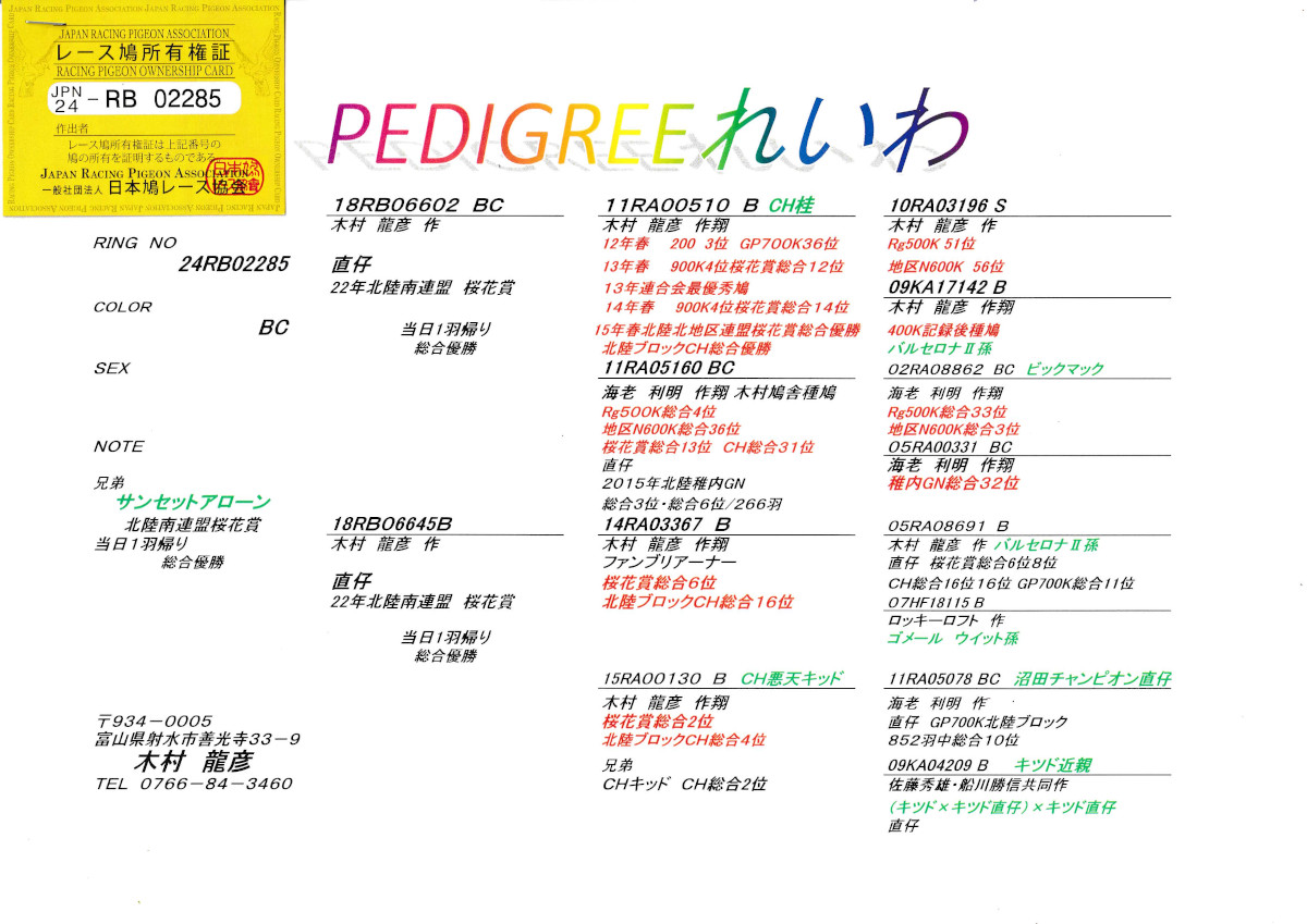 出品鳩「24RB02285 DC ♀」木村龍彦鳩舎作サンナセットアローン号22年北陸南桜花賞当日1羽帰り総合優勝鳩の全兄弟鳩です。 父親 「18RB06602 BC」木村龍彦鳩舎作 直仔に サンナセットアローン号22年北陸南桜花賞当日1羽帰り総合優勝鳩がいる CH桂号本陸CH&桜花賞総合優勝鳩 ×海老作翔RG総合4位桜花賞総合13位鳩 との直仔です。 母親 「18RB06645 B」木村龍彦鳩舎作サンナセットアローン号22年北陸南桜花賞当日1羽帰り総合優勝鳩がいる ファンブリアーナ系桜花賞総合6位鳩 ×CH悪天キッド号桜花賞総合2位北陸CH総合4位鳩 との直仔です。 詳しくは、血統書を参照してください。 <備考> 現在管理人の鳩舎で元気に暮らしています。写真12/10日に撮影しました。 菅原明鳩舎の概要はこちらをご覧ください |