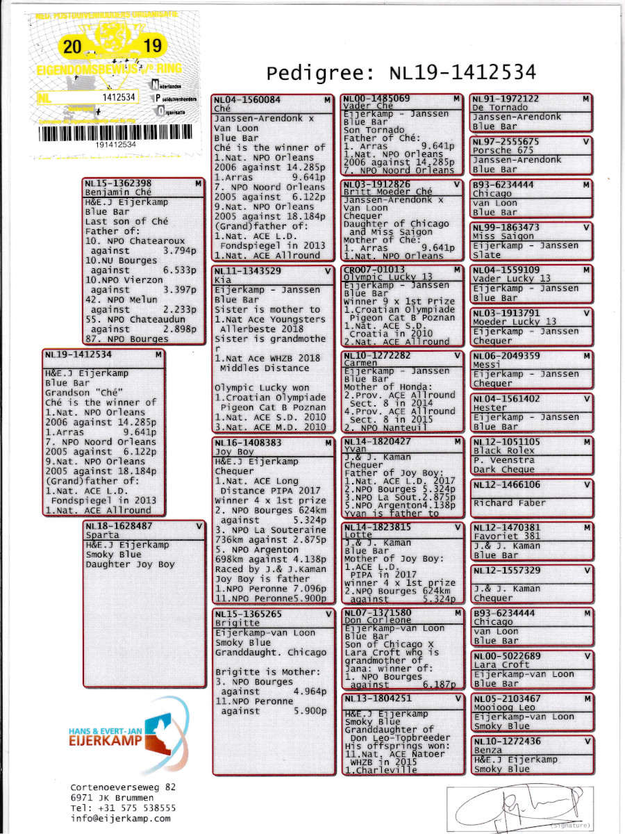 出品鳩「NL19−1412534 B♂」アイヤーカンプ鳩舎作半兄弟にブールジュNU10位シャトレエクスNPO10位ビエルゾンNPO10位鳩がいる チャー号オルレアンNPO14285羽優勝アラース9641羽優勝直仔×ジョイボーイ号PIPAナショナルAP1位NPO5324羽2位2875羽3位4138羽5位の娘鳩 との直仔です。 父親 "ベンジャミン・チャー号"「NL15−1362398 B」アイヤーカンプ鳩舎作 直仔にブールジュNU6533羽10位シャトレエクスNPO3794羽10位ビエルゾンNPO3397羽10位鳩がいる チャー号オルレアンNPO14285羽優勝アラース9641羽優勝の直仔×キァ号 との直仔です。 母親 "スパルータ号"「NL18−1628487 スモーキーB」アイヤーカンプ鳩舎作 半兄弟に ペロンヌNPO7096羽優勝ブールジュNPO4964羽3位鳩がいる ジョイボーイ号PIPAナショナルAP1位NPO5324羽2位2875羽3位4138羽5位 × プリジット号 詳しくは、血統書を参照してください。 <備考> 現在管理人の鳩舎で元気に暮らしています。写真12/10日に撮影しました。 菅原明鳩舎の概要はこちらをご覧ください |