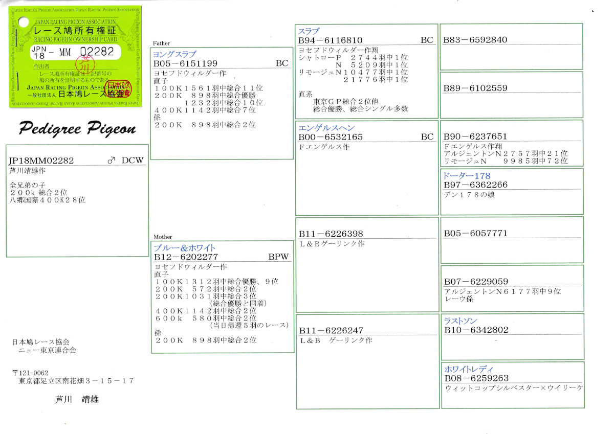 出品鳩「18MM02282 DCW ♂」芦川靖雄鳩舎作半兄弟に200K総合優勝2位3位400K総合2位7位600K総合2位鳩がいる両親ヨセフドウィルダー鳩舎作スラブ号シャトローN5209羽優勝リモージュNM10477羽優勝21776羽優勝鳩の孫鳩です。 父親 "ヨングスラブ号"「B05−6151199 BC」ヨセフドウィルダー鳩舎作 直仔に200k898羽総合優勝1232羽総合10位400K1142羽総合7位鳩がいる スラブ号シャトローN5209羽優勝リモージュN10477羽優勝21776羽優勝鳩 ×エンゲルス作エンゲルスヘン号 との直仔です。 母親 ”ブルー&ホワイト号”「B12−6202277 BPW」ヨセフドウィルダー鳩舎作 直仔に200K572羽総合2位1031羽総合3位400K1142羽総合2位600K580羽総合2位鳩 半兄弟にタルベ8755羽総合優勝がいる 両親ゲーリンクス作鳩です。 詳しくは、血統書を参照してください。 <備考> 振込または、現金書留でお願いします。 菅原明鳩舎の概要はこちらをご覧ください |