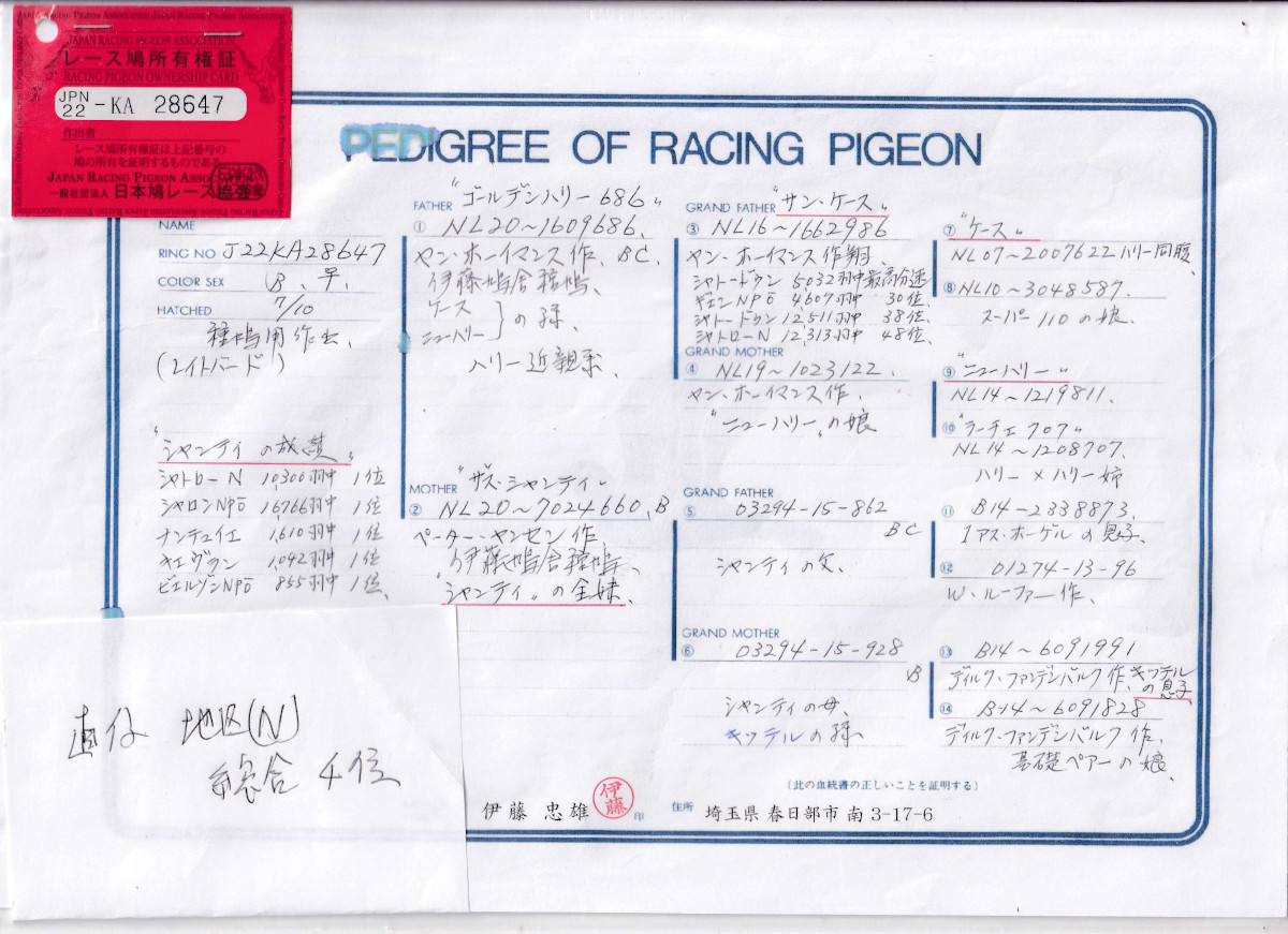 出品鳩「22KA28647 B♀」伊藤作直)PN総合4位ホーイマン作シャトーダゥン5032羽最高分速直仔×シャンタティ号シャトローNシャロンNPO優勝の全姉妹 ![]() |