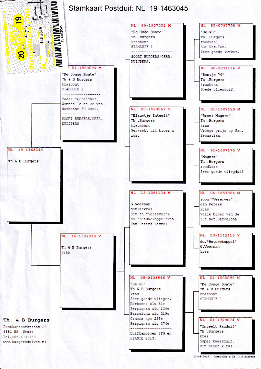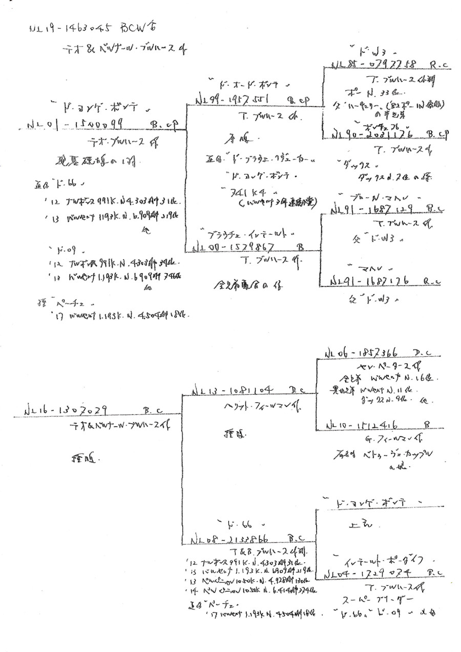 出品鳩「NL19−1463045 BCW ♂」テオ・ブルハース鳩舎作ド・ヨンゲボンチ号基礎鳩の一羽(直仔にド66号ド09号 孫鳩にペーチェ号バルセロナN18位 玄孫ド80号バルセロナN4位)×ド・66号バルセロナN219位他(直仔ベーチェ号バルセロナN18位孫ド80号バルセロナN4位)娘鳩 との直仔です。 父親 "ド・ヨンゲボンテ号"「NL01−1500099 BCP」テオ・ブルハース鳩舎作現基礎鳩の一羽 直仔にド66号ド09号 孫鳩にペーチェ号バルセロナN18位 玄孫ド80号バルセロナN4位鳩がいる 源鳩ド・オードボンチ号(ハーキュリー号半兄弟の孫)の直仔です。 母親 「NL16−1307079 BC」テオ・ブルハース鳩舎作 ヤフィールマン作有名なベトゥーヴゥカップルの孫鳩 ×ド・66号バルセロナN219位他(直仔ベーチェ号バルセロナN18位孫ド80号バルセロナN4位)との直仔です。 詳しくは、血統書を参照してください。 <備考> 現在管理人の鳩舎で元気に暮らしています。写真12/10日に撮影しました。 菅原明鳩舎の概要はこちらをご覧ください |