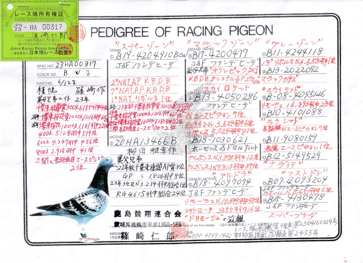 出品鳩リスト外「23HA00317 BW♂」篠崎仁郎作ファンデヒーデ作スカイロケット号KBDB-Nエース7位直仔×柳田作地区N総合優勝GP総合8位半兄弟 ![]() |