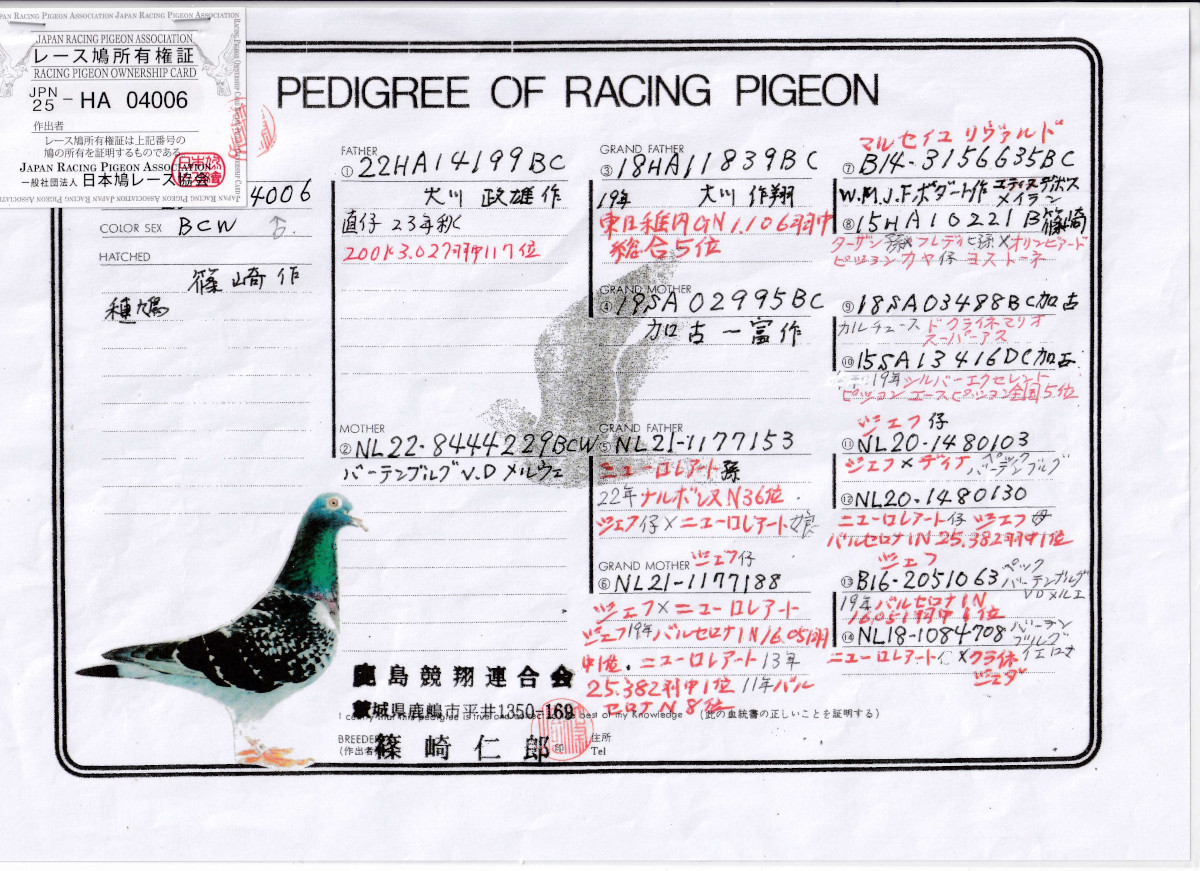 出品鳩若6番「25HA04006 BCW」篠崎仁郎鳩舎作異父兄弟に400K2645羽中367位 600K2217羽中191位鳩がいる 19年東日本GN1106羽中総合5位直仔×ジェフ号バルセロナIN総合優勝の近親孫鳩 との直仔です。 父親 ♂21番「22HA14199 BC ♂」大川政雄鳩舎作翔200k3027羽117位鳩で 19年東日本GN1106羽中総合5位×カルトース系令和CH416号CH1000K連盟総合優勝全日本AP全国5位の娘鳩 との直仔です。 母親 ♀4番「NL22−8444229 BCW♀」バーテンブルグ鳩舎作 直仔に地区N2217羽191位鳩がいる(ジェフ号直仔Xニューロレアート号娘)×(ジェフ号Xニューロレアート号クライネジェイド号の娘)娘鳩 との直仔です。 詳しくは、血統書を参照してください。 <備考> 現在管理人の鳩舎で元気に暮らしています。写真12/10日に撮影しました。 菅原明鳩舎の概要はこちらをご覧ください |