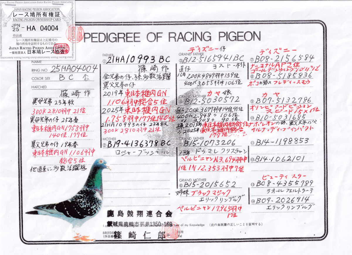 出品鳩若4番「25HA04004 BC」篠崎作両親ヨストーネ作(ディズニー号GWバルセロナN3年AP2位直仔×カヤ号オリンピアードP娘)×プシャール作ペルピナンN優勝娘鳩 ![]() |