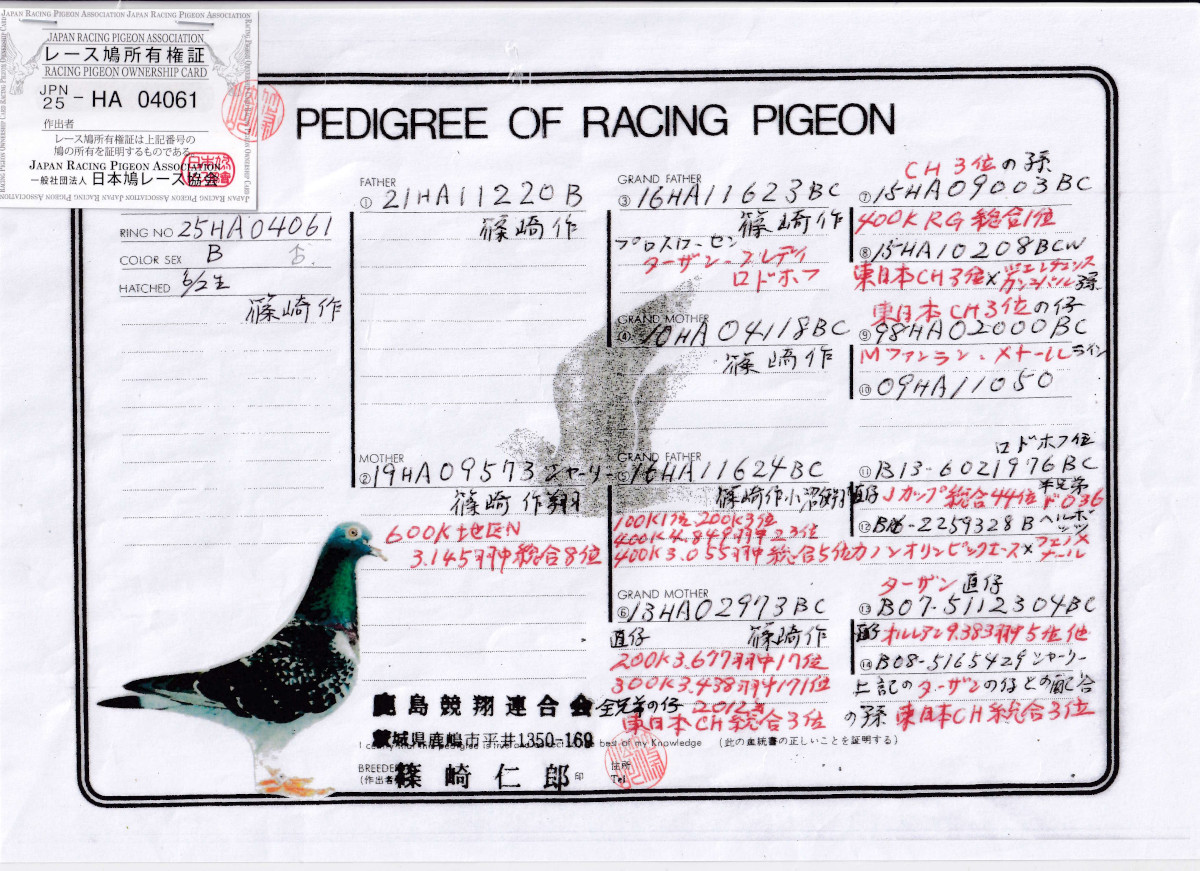 出品鳩若60番「25HA04061 B」篠崎仁郎作RG400K総合優勝の孫&12年東日本CH総合3位近親鳩×600K地区N3145羽中総合8位 ![]() |