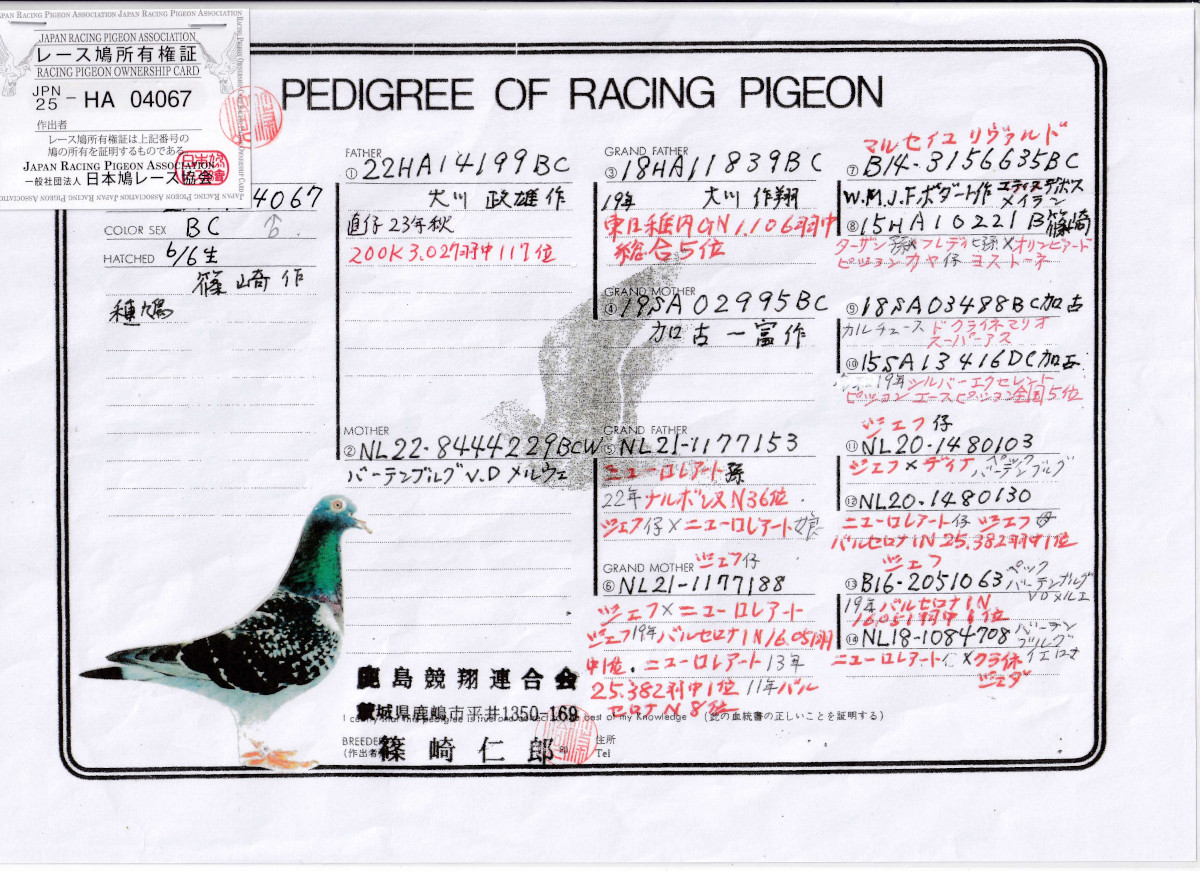 出品鳩若66番「25HA04067 BC」篠崎作半兄弟400K2645羽367位600K2217羽191位鳩19年東日本GN総合5位直仔×ジェフ号バルセロナIN総合優勝近親孫 ![]() |