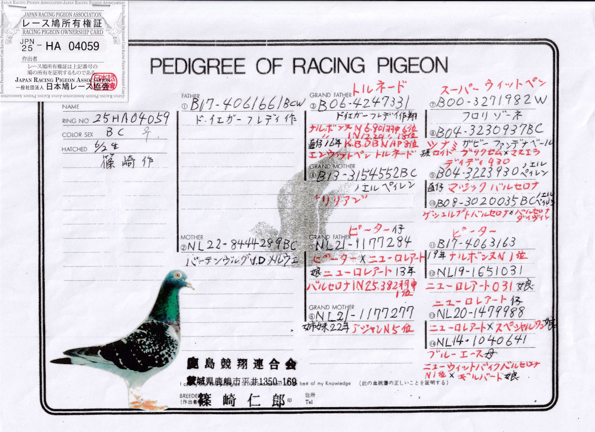 出品鳩若58番「25HA04059 BC」篠崎作ドイエガーフレディ作KBDB長距離NatAP8位半兄弟×バーテンブルグ作ピーター号ナルボンヌN優勝孫&ニューロレアート近親 ![]() |