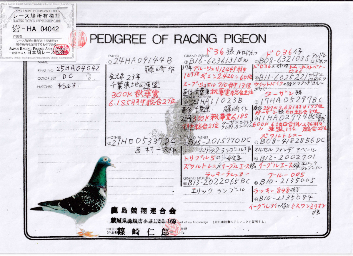 出品鳩若41番「25HA04042 DC」篠崎仁郎鳩舎作千葉東秋華賞300K6186羽中総合2位全兄弟(ロードホフ作ブルージュN12449羽中167位直仔)×西村作両親E・ランブール作トリプル5号異母兄弟×ラッキー85号孫)娘鳩 との直仔です。 父親 ♂32番「24HA09144 B ♂」篠崎仁郎鳩舎作全兄弟)千葉東秋華賞300K6186羽中総合2位鳩がいる A・ロードホフ作翔 ブルージュN12449羽中167位×(ターザン号近親孫X6地区合同600K1236羽中総合2位)娘鳩 との直仔です。 母親 ♀16番「21HE05337 DC ♀」西村一夫鳩舎作両親E・ランブール作トリプル5号異母兄弟(ワルトニー号リモージュN2位全兄弟 ×イーグルエースの娘)×(ラッキー85号直仔×リボルネN29021羽21位)娘鳩 との直仔です。 詳しくは、添付の血統書の参照をお願いいたします。 <備考> 現在管理人の鳩舎で元気に過ごしています。写真は12/10日に撮影しました。 菅原明鳩舎の概要はこちらをご覧ください |