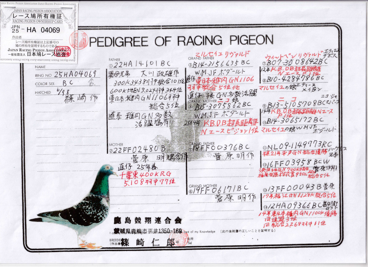 出品鳩若68番「25HA04069 BC」篠崎仁郎作半兄弟)RG総合77位大川作東日本GN総合5位半兄弟×菅原作(総理大臣連盟1位直仔×東日本GN総合11位) ![]() |