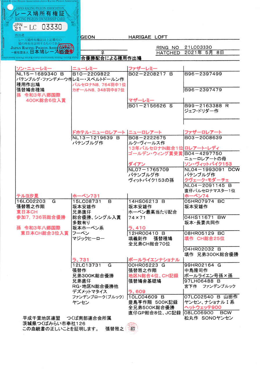 出品鳩♀16番 「21LC03330 G ♀」張替雅之鳩舎作 直仔につくば国際24年広島700K総合19位鳩がいる テルヨ汐見号東日本CH7736羽総合優勝鳩 ×バーテンブルグ作ニューレミー号バルセロナN8764羽優勝の娘鳩 との直仔です。 父親 "ソンニューレミー号"「NL15−1689340B」バーテンブルグ鳩舎作 孫鳩にR3年八郷国際400K全国6位鳩がいる ニューレミー号バルセロナN8764羽優勝×ニューロレアート号バルセロナIN総合優勝の娘鳩 との直仔です。 母親 "テルヨ汐見号"「16LC02203 G」張替雅之鳩舎作翔 東日本CH7736羽総合優勝 孫鳩にもR3年八郷国際CH900K全国3位鳩がいる 坂本ホーベン731号×ラ731号基礎鳩ボールライエンナショナル号娘鳩 との直仔です。 詳しくは、添付の血統書の参照をお願いいたします。 <備考> 現在管理人の鳩舎で元気に過ごしています。写真は12/18日に撮影しました。 菅原明鳩舎の概要はこちらをご覧ください |