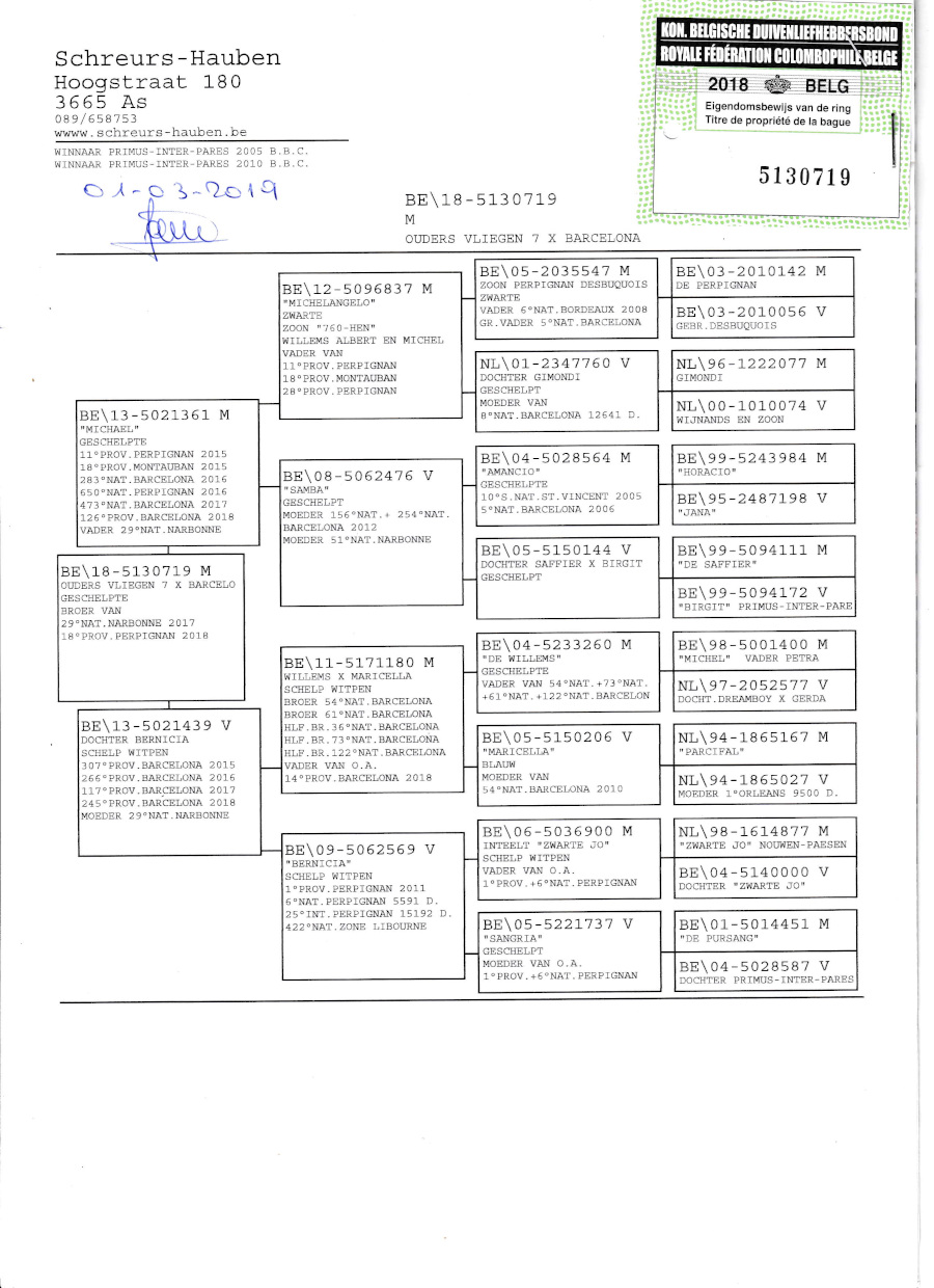 出品鳩♂2番「B18−5130719 BC♂」シュルールスハウベン作全兄弟)ナルボンヌN一才29位 マイケル号バルセロナN3年連続入賞×バルセロナ4連連続入賞 ![]() |