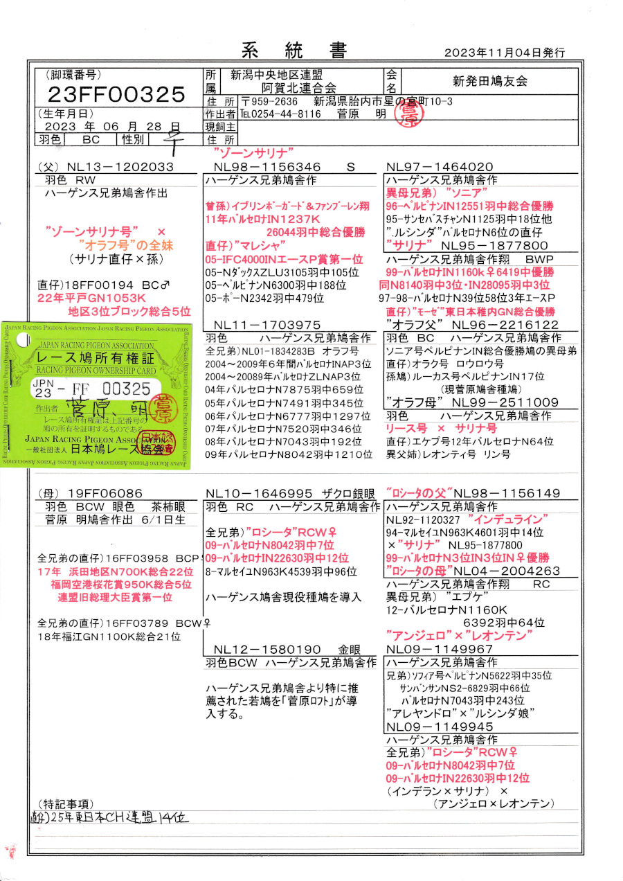 出品鳩♀25番 「23FF00325 BC ♀」菅原 明鳩舎作直仔に25年東日本CH連盟14位鳩がいる 純ハーゲンス系ゾーンサリナ号直仔&サリナ号孫×ロシータ号(サリナ号孫)全兄弟の娘鳩 との直仔です。 父親 「NL13−1202033 RW」ハーゲンス兄弟鳩舎作 直仔に平戸GN1100K総合5位鳩がいる ゾーンサリナ号×オラフ号バルセロナIN6年間AP3位の全兄弟鳩 との直仔です。 母親 「19FF06086 BCW」菅原 明鳩舎作 全兄弟の直仔に 総理大臣賞連盟1位 福江GN総合21位 平戸GN総合4位15位19位鳩がいる ロシータ号バルセロナN7位IN12位全兄弟&サリナの孫鳩掛けロシータ号全姉妹の娘鳩 との直仔です。 詳しくは、添付の血統書の参照をお願いいたします。 <備考> 現在管理人の鳩舎で元気に過ごしています。写真は12/18日に撮影しました。 菅原明鳩舎の概要はこちらをご覧ください |