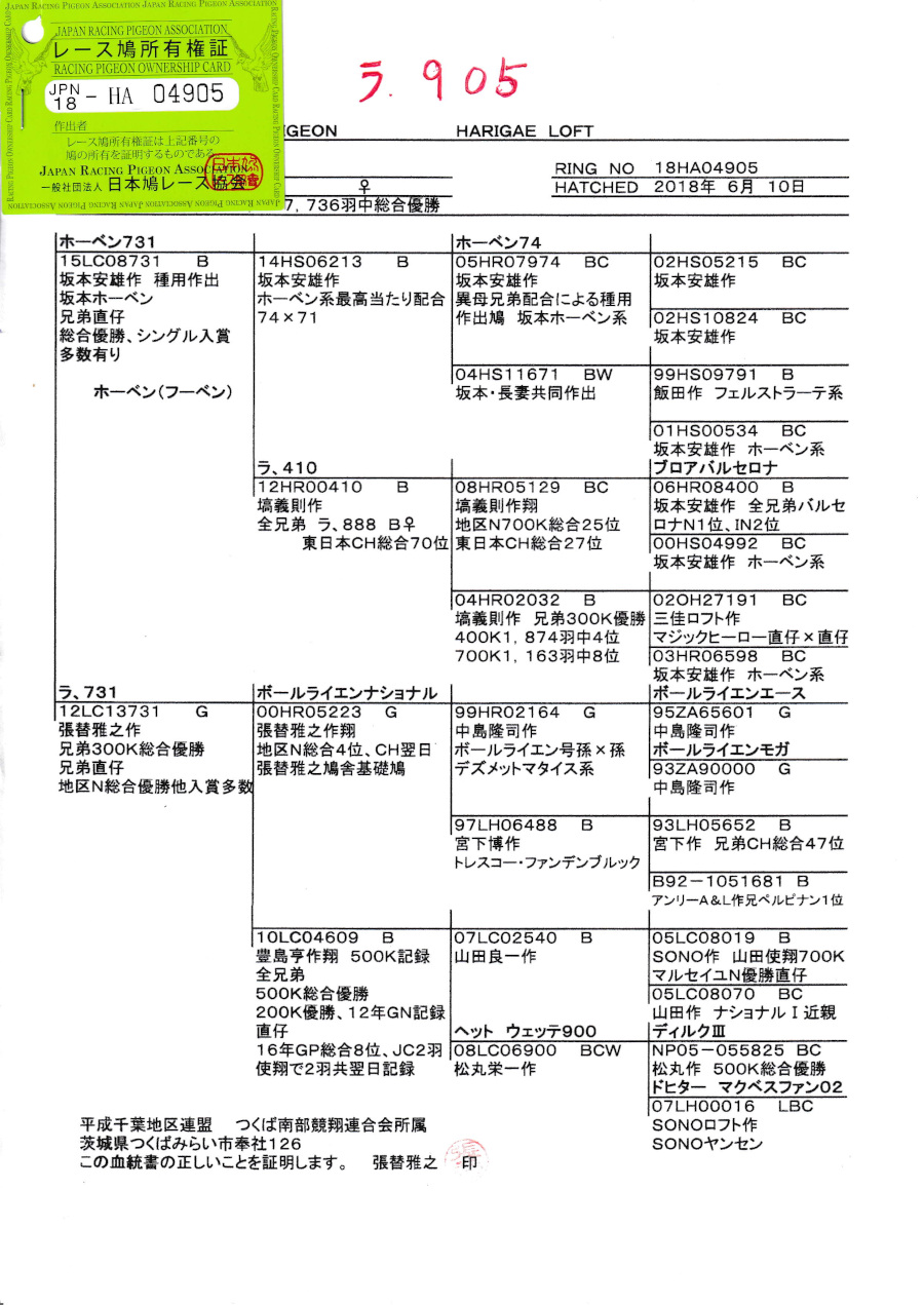 出品鳩♀4番ラ905号「18HA04905 B♀」張替雅之鳩舎作 テルヨ汐見号 東日本CH7736羽総合優勝の全兄弟鳩 ![]() |