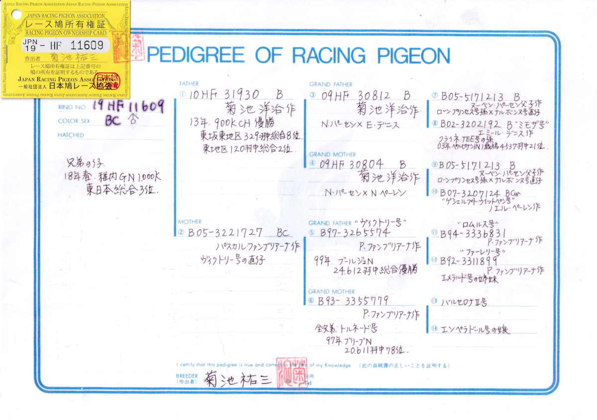 出品鳩♂13番 「19HF11609 BC ♂」菊池祐三鳩舎作兄弟直仔に18年東日本GN総合3位鳩がいる 13年CH900K優勝東坂東地区329羽総合8位×ファンブリアーナ作 ヴィクトリー号ブールジュN24612羽総合優勝の娘鳩 との直仔です。 父親 「10HF31930 B」菊池洋治鳩舎作翔 13年CH900K優勝東坂東地区329羽総合8位鳩で ナルボンヌ号ローンプリンセス号近親鳩(Nパーセン作×Eデニス作)直仔X(Nバーセン作×Nペーレン作)娘鳩 との直仔です。 母親 「B05−322727BC」P・ファンブリアーナ鳩舎作 ヴィクトリー号ブールジュN24612羽総合優勝 ×トルネード号ブリーブN20611羽78位の全兄弟鳩 との直仔です。 詳しくは、添付の血統書の参照をお願いいたします。 <備考> 現在管理人の鳩舎で元気に過ごしています。写真は12/18日に撮影しました。 菅原明鳩舎の概要はこちらをご覧ください |
