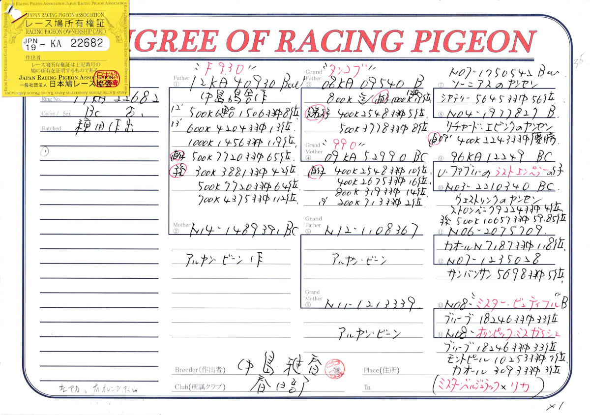 出品鳩♂14番「19KA22682 BC♂」中島雅春作半兄弟)500k7720羽65位 F930号秋500k1506羽8位600k4204羽13位1000k119位×オリンピックミスハイシェ号孫鳩 ![]() |