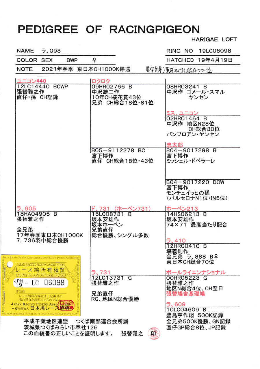 出品鳩♀9番「19LC06098 BW♀」張替雅之作翔21年東日本CH帰還半兄弟)CH総合77位25年CH連盟14位 ユニコン440号×テルヨ汐見号CH総合優勝全兄弟 ![]() |