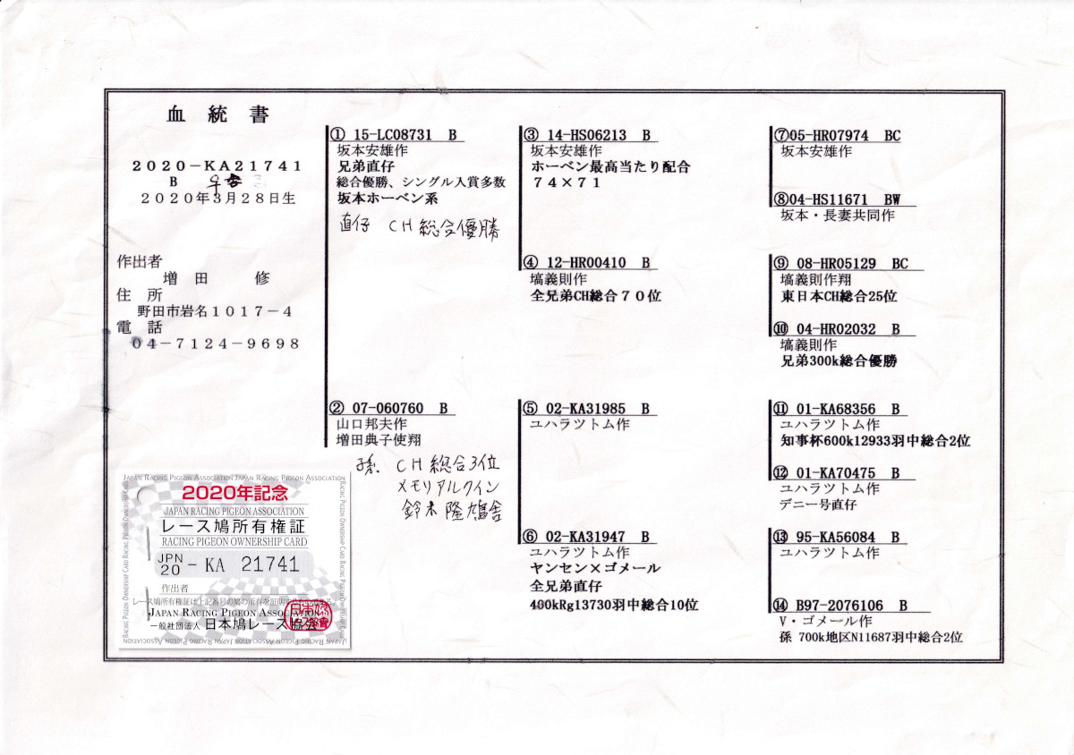 出品鳩♀11番 「20KA21741 B ♀」増田 修鳩舎作 テルヨ汐見号 東日本CH7736羽総合優勝鳩の異母兄弟 坂本ホーベン731号×両親ユハラ作知事杯600K12933羽総合2位の孫鳩 との直仔です。 父親 "ホーベン731号"「15LC08731 B」坂本安雄鳩舎作 直仔にテルヨ汐見号 東日本CH7736羽総合優勝鳩がいる 坂本ホーベン当たり配合(74×71)直仔×塙作CH総合70位全兄弟鳩 との直仔です。 母親 「日07−060760 B」山口邦夫鳩舎作増田翔 孫に鈴木鳩舎メモリアルメクィン号CH総合3位鳩がいる 両親ユハラ作知事杯600K12933羽総合2位直仔×ヤンセン・ゴメール系鳩 との直仔です。 詳しくは、添付の血統書の参照をお願いいたします。 <備考> 現在管理人の鳩舎で元気に過ごしています。写真は12/18日に撮影しました。 菅原明鳩舎の概要はこちらをご覧ください |