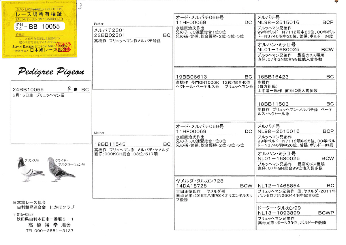 | 出品鳩♀3番「24BB10055 BC♀」高橋裕幸作半兄弟)CH900K517総合103位 水越作オードメルバチ069号(メルパチ号ボルドーN25位26位直仔)直仔×直娘 | オークションNo: 1766108563 |