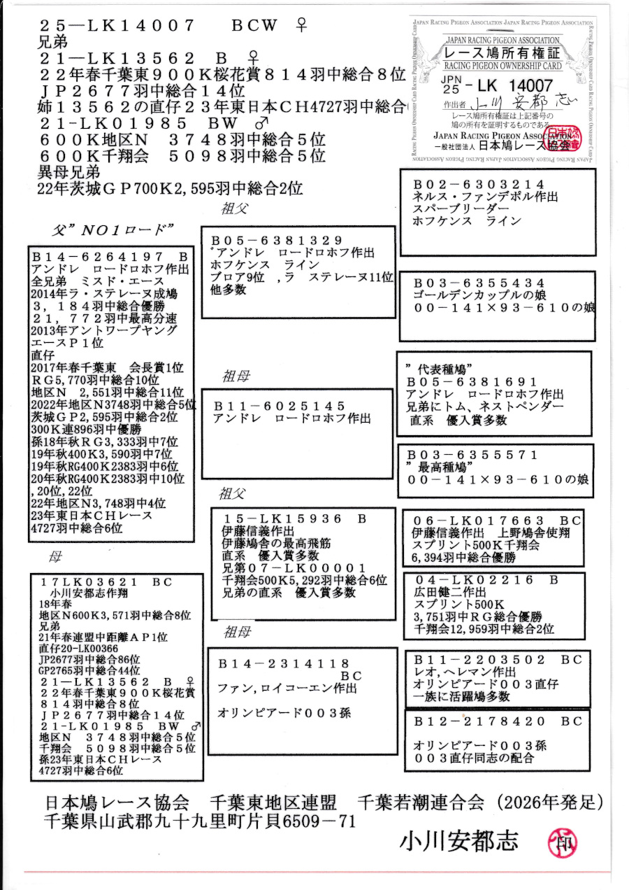 出品鳩リスト外「25LK14007 BCW」小川安都志作兄弟)桜花賞総合8位JC総合14位鳩PN総合5位鳩半兄弟)茨城GP総合2位姉の仔)東日本CH総合6位 ![]() |