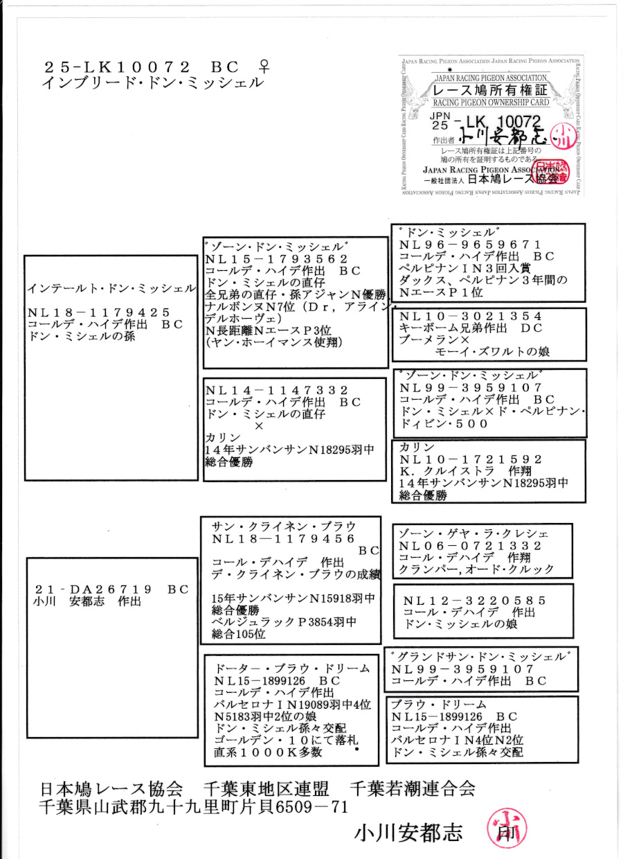出品鳩リスト外「25LK10072 BC」小川作純コールデハイデ系 ドン・ミッシェル号近親孫×(サンバンサンN優勝直仔×ブラウドリーム号バルセロナIN4位娘 ![]() |