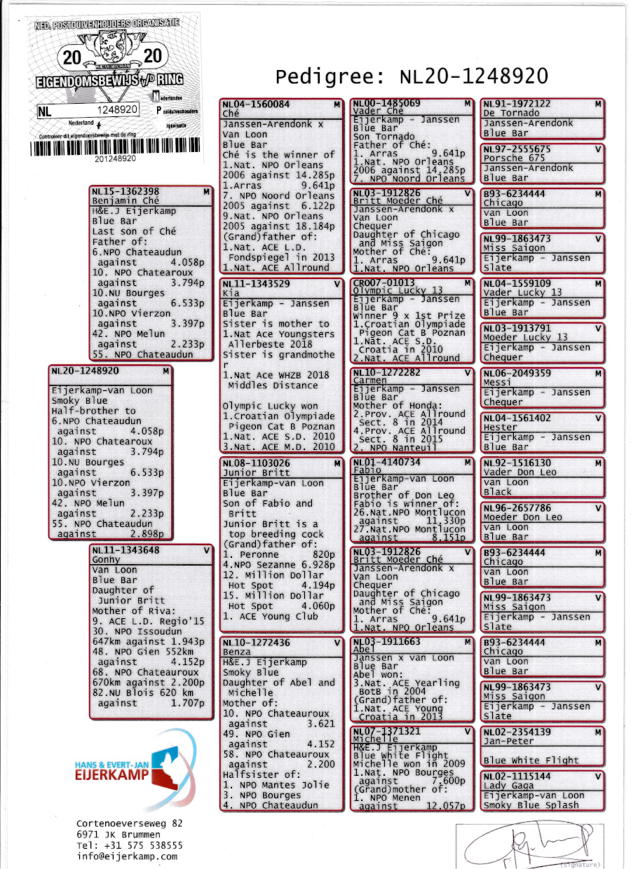 出品鳩「NL20−1248920 B♂」アイヤーカンプ作半兄弟)ブールジュNU10位他NPO10位2回 オルレアンNPO14285羽優勝直×グンナイ号(直仔NPO30位48位58位) ![]() |
