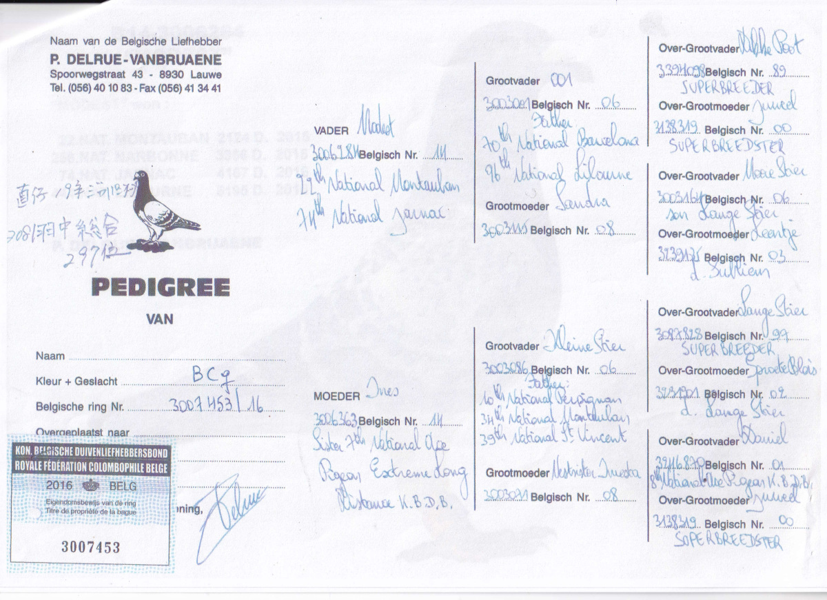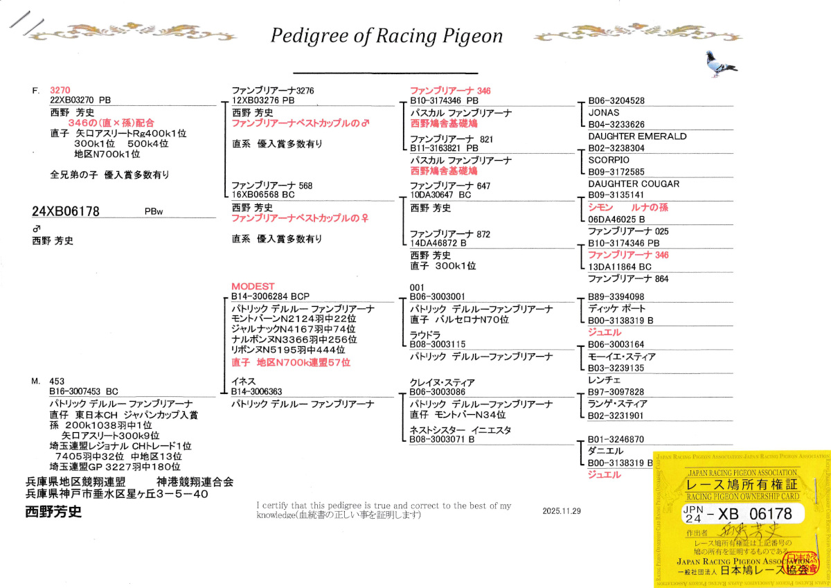 出品鳩「24XB06178 PBW ♂」西野芳史鳩舎作半兄弟に東日本CH&Jカップ入賞RG400K優勝300k優勝地区N700K優勝鳩がいる 3270号(ファンブリアーナベストカップルの♂×♀)×ファンブリアーナ作モデスト号モントバーンN2124羽22位ジャルナックN4167羽74位の娘鳩 との直仔です。 父親 ”3270号”「22XB03270 PB」西野芳史鳩舎作 直仔に RG400K優勝300k優勝地区N700K優勝鳩がいる ファンブリアーナベストカップルの♂×ファンブリアーナベストカップルの♀鳩 との直仔です。 母親 「B16−3007453 BC」パトリック・デルルファンブリアーナ鳩舎作 直仔に東日本CH&Jカップ入賞鳩がいる モデスト号モントバーンN2124羽22位ジャルナックN4167羽74位×イネス号(異母兄弟モントバーンN34位)との直仔です。 詳しくは、血統書を参照してください。 <備考> 現在管理人の鳩舎で元気に暮らしています。写真12/21日に撮影しました。 菅原明鳩舎の概要はこちらをご覧ください |
