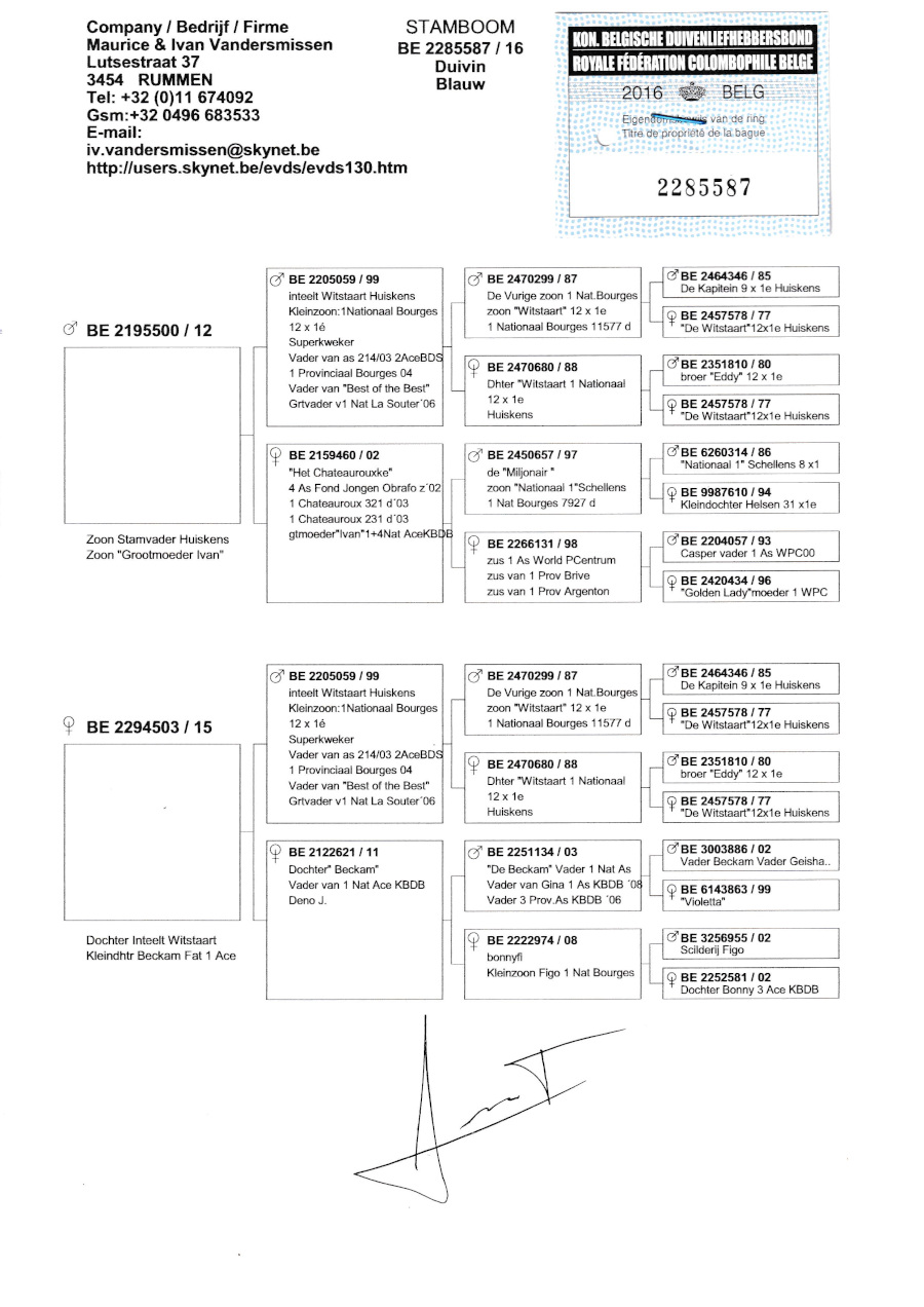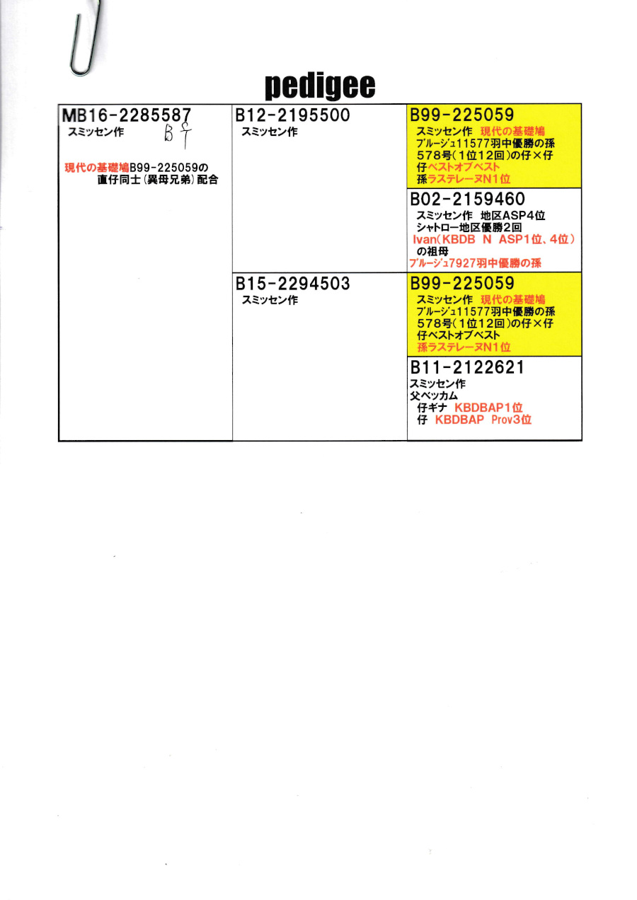 出品鳩「B16−2285587 B♀」スミッセン作現在基礎鳩(ブールジュ11577羽優勝孫&ペストオブベストの父親)直仔×直娘の異母兄弟交配の直仔 ![]() |