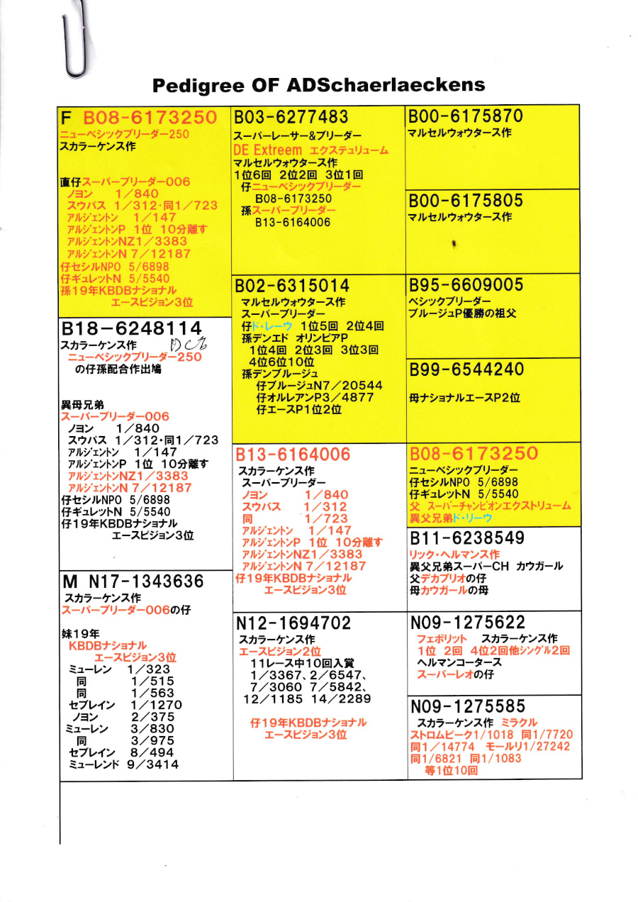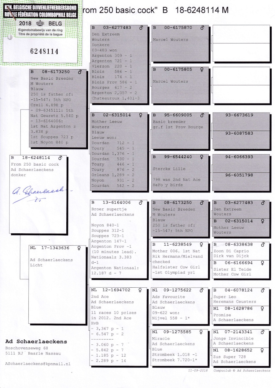 出品鳩「NL18−6248114 DC♂」アド・スカーラケンス作半兄弟)スーハーブリーダー006号アルジェントンNZ優勝 ドレーウ号半兄弟×スーハーブリーダー006号娘 ![]() |