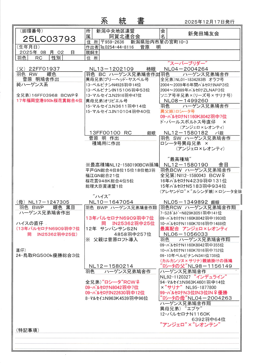 出品鳩「25LC03793 RC」菅原 明作純ハーゲンス系鳥取RG500K総合3位全兄弟×ハイス号バルセロナN7位の娘鳩 親息子交配直仔 ![]() |