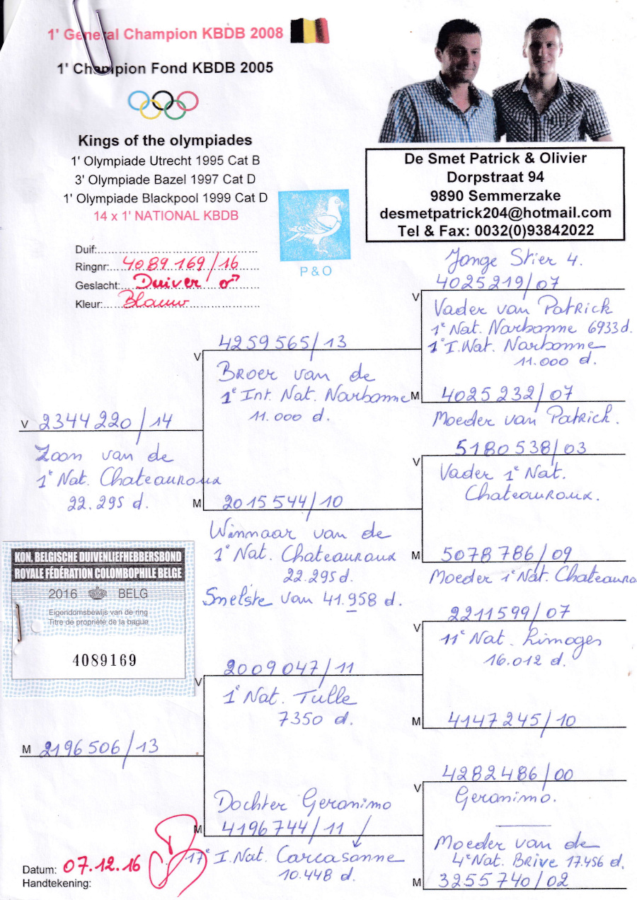 出品鳩「B16−4089169 B♂」A&Pデズメット鳩舎作直仔に東日本CH1000K6021羽総合908位200k784羽6位鳩がいる北野ベルギー鳩舎作翔シャトローN22296羽総合優勝直仔× ツールN7350羽総合優勝の娘鳩 との直仔です。 父親 「B14−2344220」A&Pデズメット鳩舎作 ナルボンヌIN11000羽総合優勝の兄弟 × 北野ベルギー鳩舎作翔シャトローN22296羽総合優勝&41958羽最高分速鳩 との直仔です。 母親 「B13−2196506」 ツールN7350羽総合優勝 ×カオールSN104458羽総合17位の娘&ブリーブN総合4位の半兄弟鳩 との直仔です。 詳しくは、血統書を参照してください。 <備考> 現在管理人の鳩舎で元気に暮らしています。写真12/21日に撮影しました。 菅原明鳩舎の概要はこちらをご覧ください |