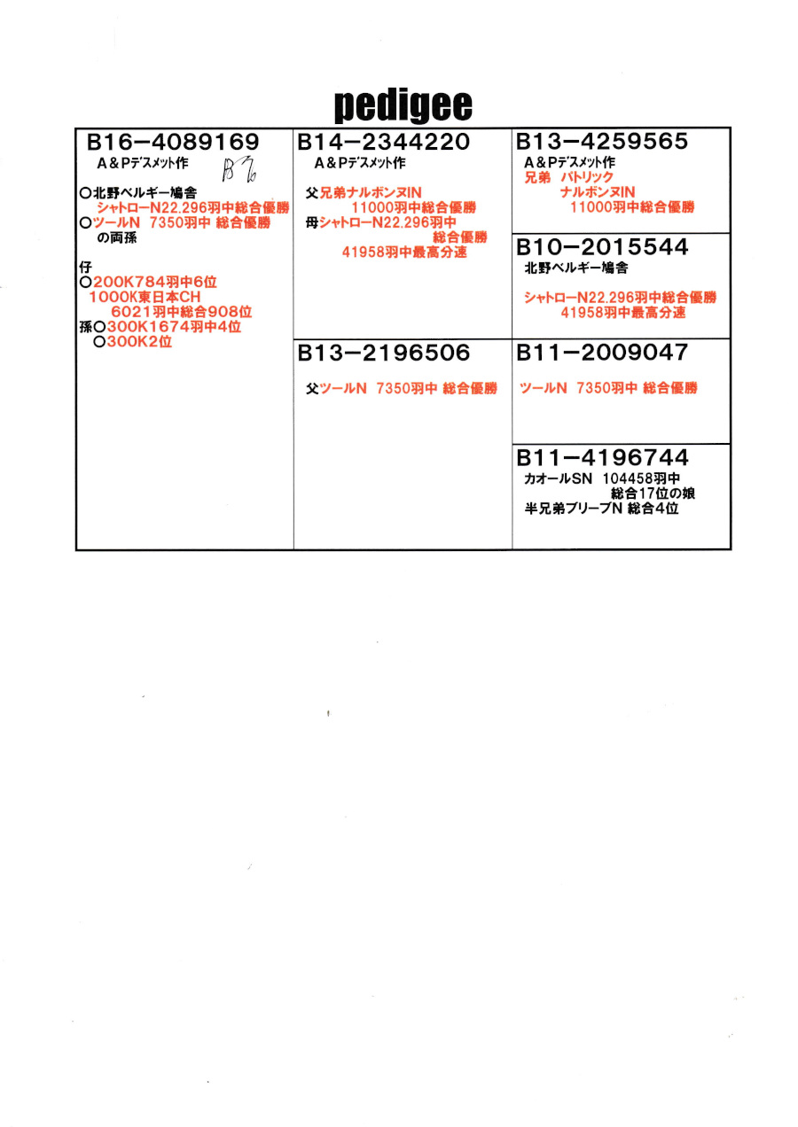 出品鳩「B16−4089169 B♂」A&Pデズメット作直仔)東日本CH総合908位北野ベルギー鳩舎シャトローN22296羽総合優勝直仔×ツールN7350羽総合優勝娘 ![]() |