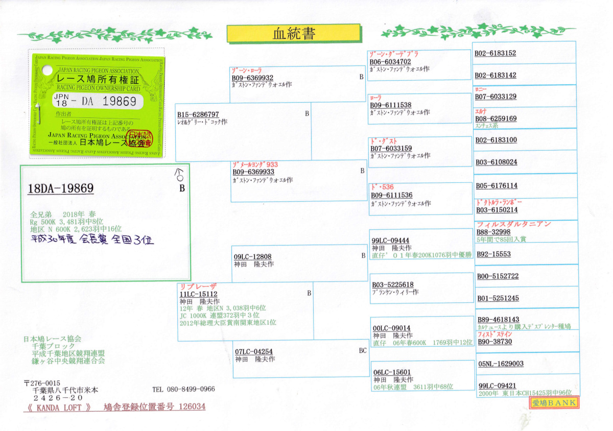出品鳩「18DA19869 B♂」神田ロフト作全兄弟)H30年会長賞全国3位 ゲリー・ドコック作(純ガストン系)×リブレーザ号総理大臣賞南関東地区1位 ![]() |